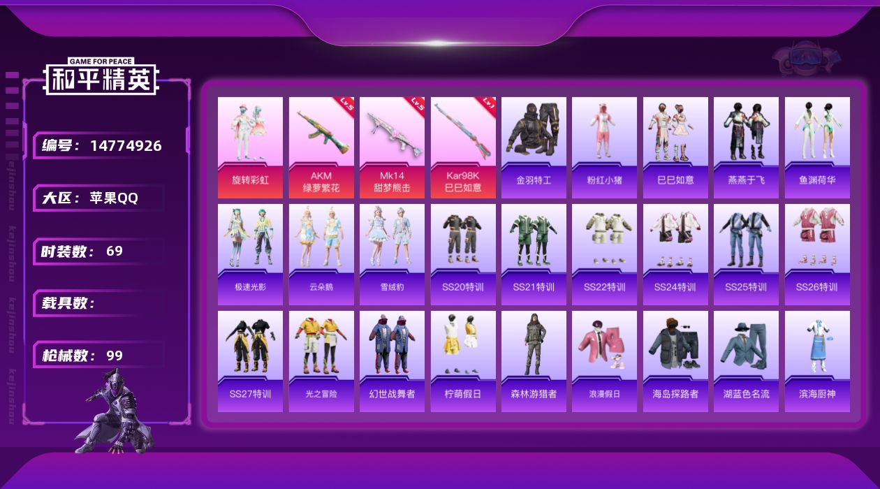 [14774926]【店主推荐捡漏号!可直接换绑】苹果 手Q-1粉装-3特效枪-0载具-0粉色飞行器-26303热力值-2王牌印记-69套装-99枪皮
