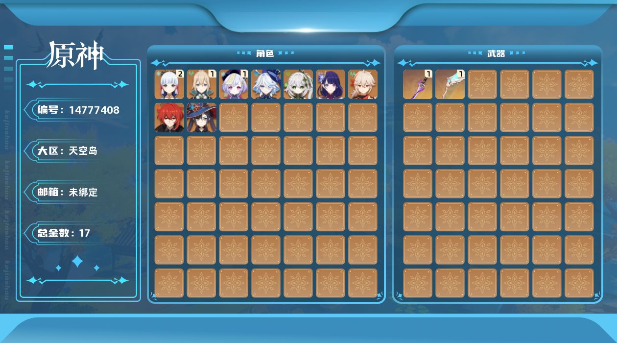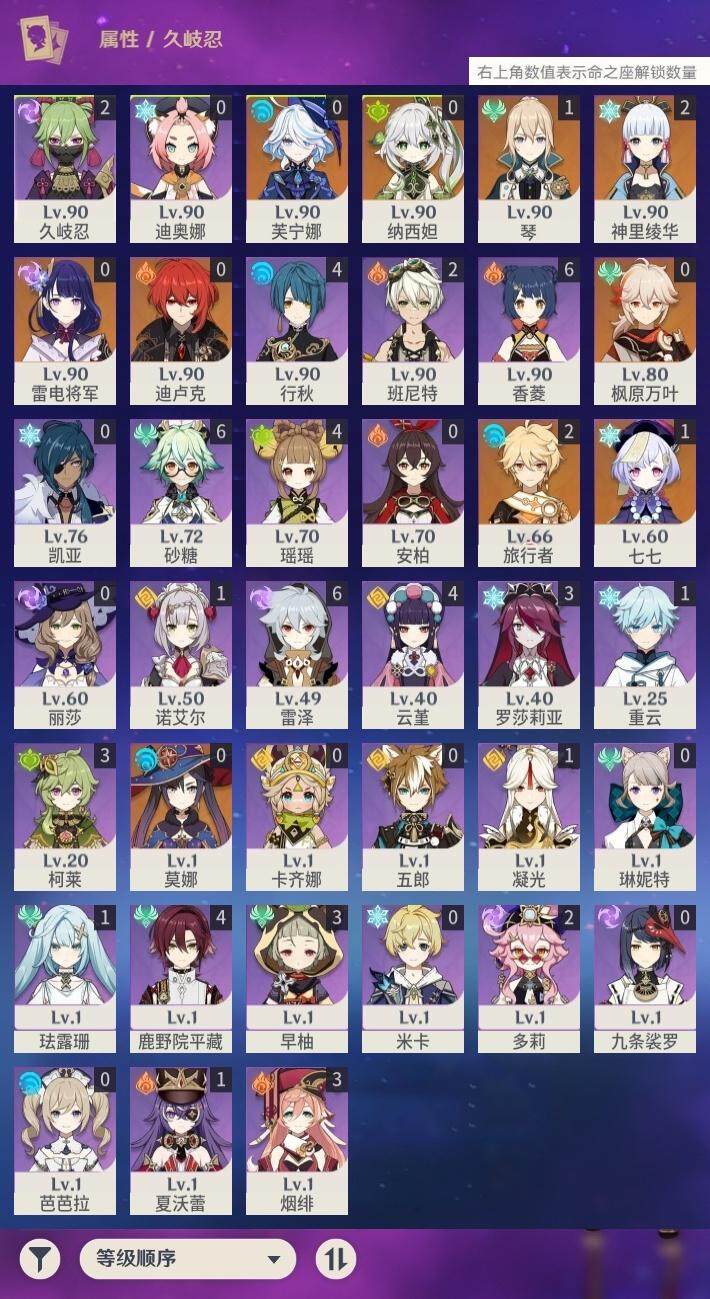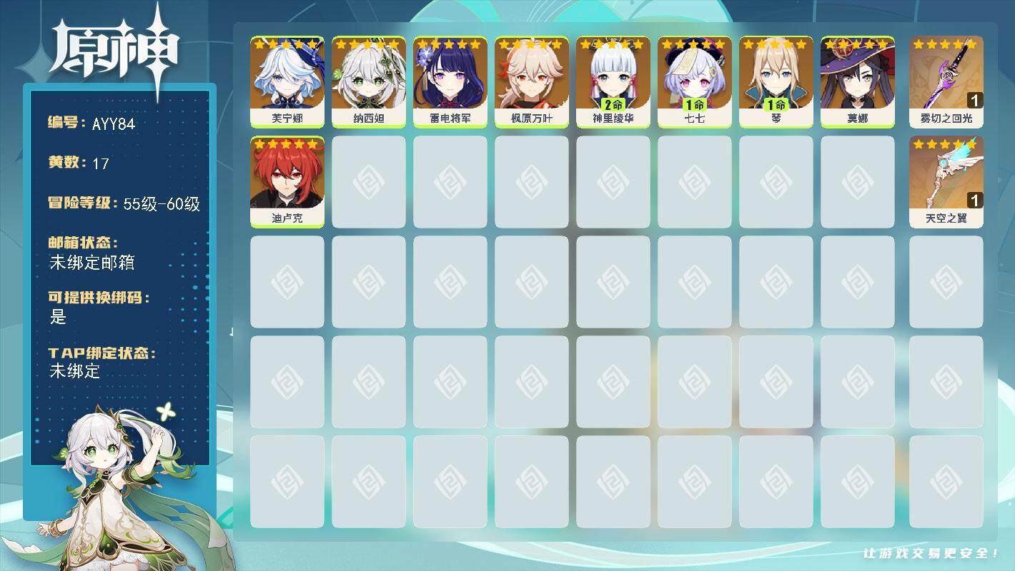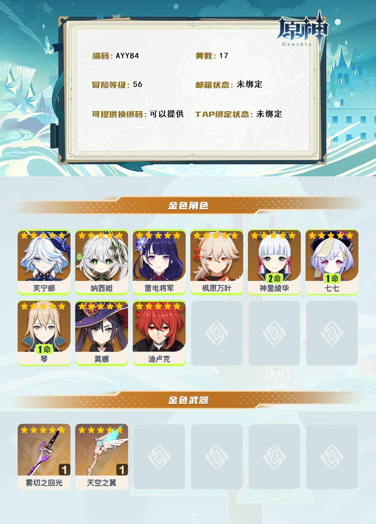[14777408]56级/17黄/男主/9个五星角色/4个五星武器 0命芙宁娜,0命纳西妲,0命雷电将军,0命枫原万叶,2命神里绫华,1命七七,1命琴,0命莫娜,0命迪卢克,精1雾切之回光,精1天空之翼