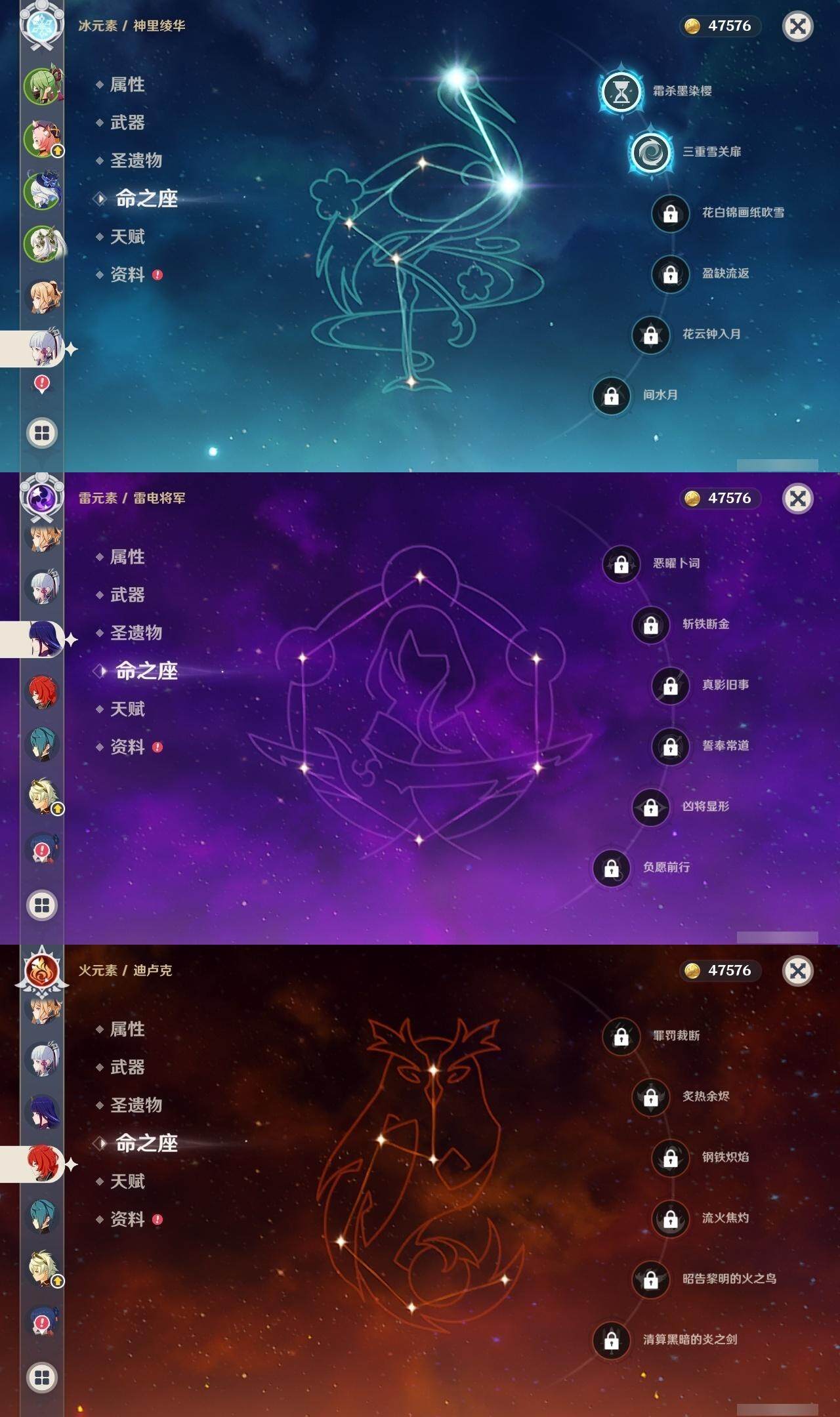 0命芙宁娜,0命纳西妲,0命雷电将军,0命枫原万叶,2命神里绫华,1命七七,1命琴,0命莫娜,0命迪卢克,精1雾切之回光,精1天空之翼