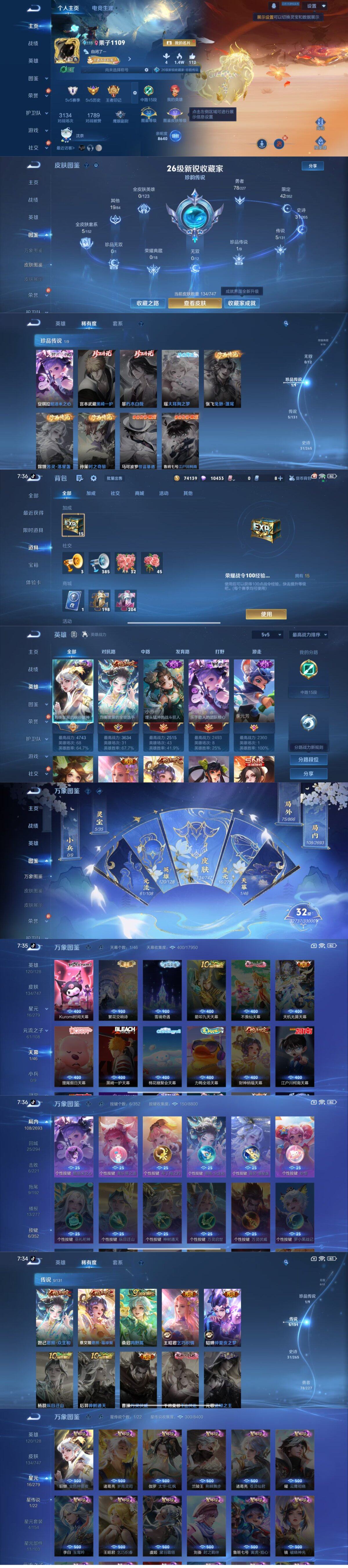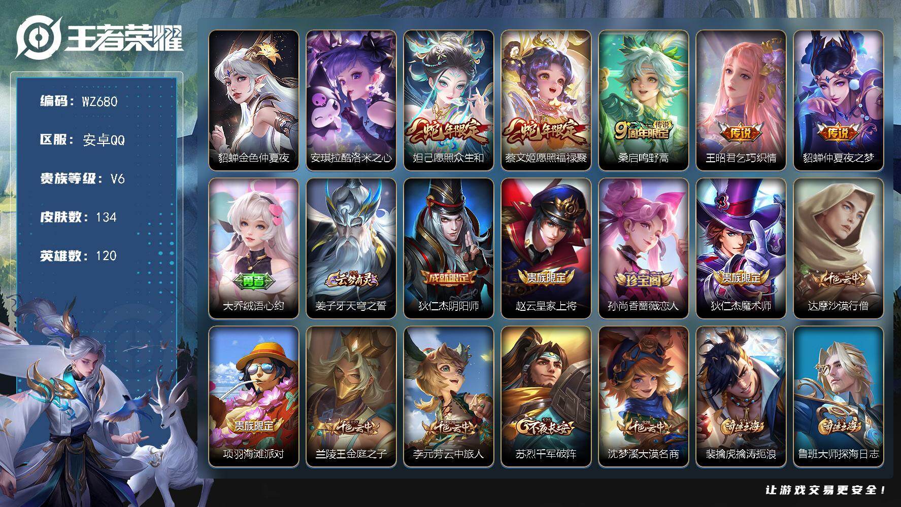- [11820089]V9 3典藏 2无双 3珍品传说 39传说 124英雄 380皮肤 可修改实名 优质装备:鸣剑·曳影,全息碎影(猴子典藏),赤影疾锋,小乔时之魔女(小乔无双),器灵·螭龙剑,江户川柯南,怪盗基德,酷洛米之心,黄金射手座,冠军飞将,云鹰飞将(小将军),久胜战神,炽阳神光,一念神魔,末日机甲-孙尚香(绿蚂蚱),地狱火,仲夏夜之梦(大飞蛾),地狱之眼,音你心动-周瑜,胖达荣荣,乞巧织情,淬星耀世,超时空战士-狄仁杰,末日机甲-孙策,无双飞将,碎云,鹤羽星尊,妄想实况,惊梅引,遇见神鼓,鲁班七号-时之奇旅,霜月吟,澜逐花归海,琥珀纪元马超 传说皮:乘龙·问璇玑(孙尚香年限),乘龙·铭钟鼎(赵云年限),乘龙·淬吴钩(孙策年限),典韦战鼓燎原,云诺千山,祥瑞亨通 珍宝阁皮:妄想食味,优雅恋人,玩趣恶龙 限定皮:愿照·众生和(妲己年限),映山客,鸣野蒿,夏侯惇霜北刀,至尊宝,凤求凰(白切鸡),神威(电光马子),飞衡(韩信年限),五谷丰年,冰锋战神,武圣,天狼运算者,游园惊梦,梁祝,御风骁将(吕布年限),烈魂,天狼征服者,李小龙,朱雀志(守约年限),如梦令-后羿,霸王别姬-虞姬,孙行者,猪悟能,大圣娶亲,冰霜恋舞曲,神器·万象笔 史诗皮:鸭鸭历险记-刘禅,绮世丹青,化蝶舞,龙之律动,茶境仙,破空之剑,琥珀纪元伽罗,蔬乡物语(鲁班七号),乘龙·聚宝船(安琪拉年限),乘龙·忆丹青(大乔年限),百相守梦-百里守约,遇见神鹿,紫霞仙子,电玩小子(小书包),白龙吟,黄金分割率,特工魅影,千年之狐,江河有灵,高渐离燃音魔法,蒙恬荣光圣徽,冰冠公主,青蛇,偶像歌手,白蛇,电玩·爆裂旋风,暗夜猫娘,百相守梦(关羽),龙骑士(小龙虾),末日机甲-吕布,猫狗日记-孙策,猫狗日记-大乔,乱世虎臣,节奏热浪,修罗,女仆咖啡,摇滚巨星,水果甜心,天才门将,星夜王子,心灵骇客,功夫厨神,德古拉伯爵,暗隐猎兽者,幽灵船长,鬼剑武藏,心灵战警,乐园奇幻夜,舞动绿茵,地狱岩魂,纤云弄巧,繁星吟游(呼啦呼啦),缤纷独角兽,乘风破浪,逐浪之夏,月团寄思,水晶猎龙者,曙光守护者,箭羽风息,金属风暴,原初追逐者,圣诞狂欢,圣诞恋歌,鹰眼统帅,魅力维加斯,无心,未来纪元-赵云
