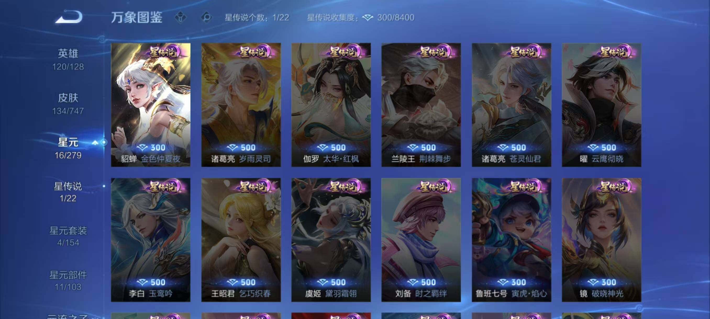 【史诗皮肤】:赵云皇家上将,貂蝉圣诞恋歌,王昭君偶像歌手,狄仁杰魔术师,宫本武藏鬼剑武藏,孙尚香蔷薇恋人,孙尚香水果甜心,嬴政摇滚巨星,妲己魅力维加斯,墨子龙骑士,吕布圣诞狂欢,李白千年之狐,张飞乱世虎臣,刘邦德古拉伯爵,小乔缤纷独角兽,雅典娜冰冠公主,安琪拉心灵骇客,蔡文姬舞动绿茵,李元芳逐浪之夏,白起星夜王子,狄仁杰鹰眼统帅,小乔青蛇,孙尚香时之恋人,貂蝉唤灵魅影,阿轲化蝶舞,狂铁龙之律动,后羿石田雨龙,黄忠百相守梦,公孙离涂山容容,女娲万灵启世,少司缘巫礼祀神