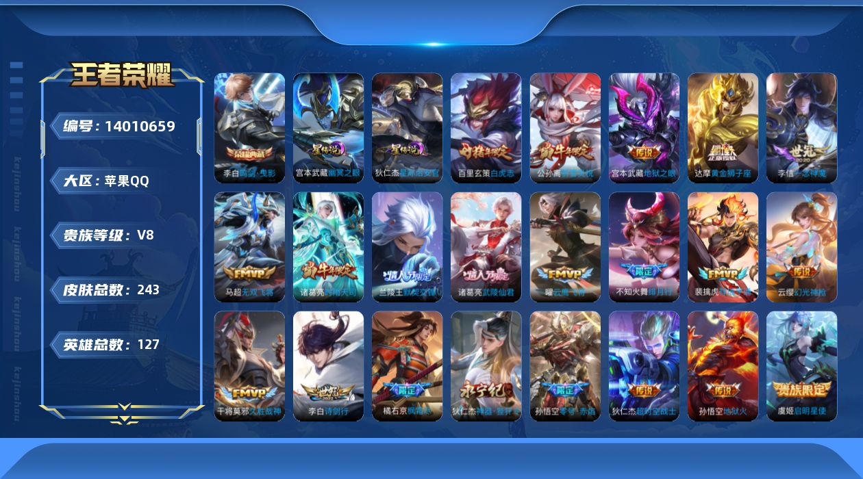 [14010659]【店主推荐捡漏号!可直接换绑苹果Q-V8-最强王者段位-127英雄-243皮肤-1典藏-2星元-22传说-63史诗