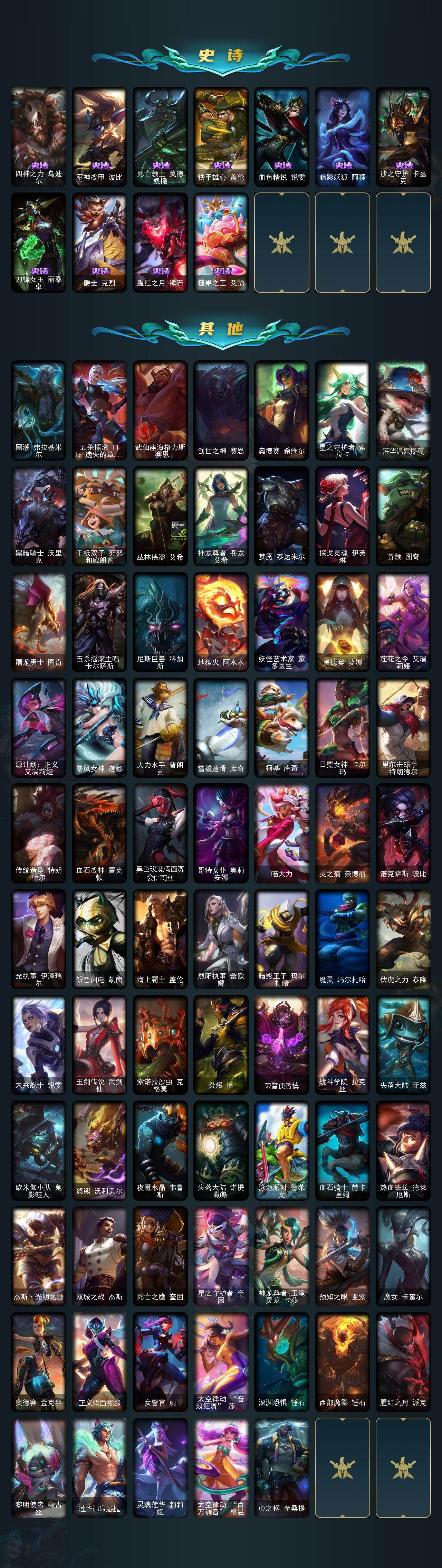 【其他皮肤1】:黑潮弗拉基米尔,五杀摇滚III遗失的章节凯尔,武仙座海格力斯赛恩,创世之神赛恩,奥德赛希维尔,星之守护者索拉卡,莲华温泉提莫,黑暗骑士沃里克,千纸双子努努和威朗普,丛林侠盗艾希,神龙尊者苍龙艾希,梦魇泰达米尔,探戈灵魂伊芙琳,首领图奇,屠龙勇士图