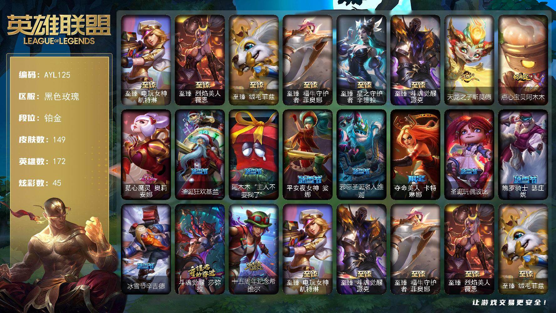 [14792681][店主推荐捡漏号]铂金段位-172英雄-149皮肤-45炫彩-1终极-7神话-27限定-21传说-18史诗 【至臻皮肤】:至臻电玩女神凯特琳,至臻烈焰美人薇恩,至臻绒毛菲兹,至臻福牛守护者菲奥娜,至臻星之守护者辛德拉,至臻斗魂觉醒派克 【臻彩皮肤】:无畏骑士瑟庄妮赤子初心,冠军之刃锐雯2016凯旋圣装,冠军之血希瓦娜凯旋圣装,黎明使者锐雯黑夜使者,霸天巨兽雪崩墨菲特,可爱可爱粉红红布里茨,魔女阿卡丽虚荣 【年限皮肤】:天龙之子斯莫德,点心宝贝阿木木 【情人节限定】:觅心魔灵奥莉安娜 【冰雪限定】:圣诞狂欢基兰,阿木木“主人不要我了”,平安夜女神娑娜,邪恶圣诞老人维迦,夺命美人卡特琳娜,圣诞玩偶波比,魄罗骑士瑟庄妮,冰雪节辛吉德 【终极皮肤】:斗魂觉醒莎弥拉 【神话皮肤】:十五周年纪念希维尔,至臻电玩女神凯特琳,至臻斗魂觉醒派克,至臻福牛守护者菲奥娜,至臻烈焰美人薇恩,至臻绒毛菲兹,至臻星之守护者辛德拉 【限定皮肤】:2023全球总决赛雷克顿,Fnatic嘉文四世,Fnatic卡尔萨斯,暗杀星努努和威朗普,暗裔英雄盖伦,胜利凤凰艾尼维亚,胜利之王泰达米尔,胜利巨口克格莫,胜利女神娑娜,胜利剑圣易,胜利之运崔斯特,魅惑女巫迦娜,密林猎手提莫,暗影沃里克,都铎王朝图奇,双城之战2微光实验室辛吉德 【传说皮肤】:铁哥们儿奥拉夫,地狱之门卫士加里奥,战地机甲厄加特,战场女武神凯尔,约德尔国队长提莫,合金巨兽努努和威朗普,源计划联合艾希,西部天使艾希,绅士科加斯,黯晶凤凰艾尼维亚,冰霜之刃艾瑞莉娅,丧尸布兰德,神拳李青,源计划净化薇恩,星之守护者拉克丝,灵魂莲华阿狸,苍穹之光韦鲁斯,宇航员诺提勒斯,暗星尊烬,西部天使赛娜,西部魔影卢锡安 【史诗皮肤】:圣洁化身索拉卡,兔宝宝提莫,夜行义贼艾瑞莉娅,驯龙大师斯维因,三昧真火孙悟空,防弹武僧李青,深海妖姬卡西奥佩娅,四神之力乌迪尔,军神战甲波比,死亡领主莫德凯撒,铁甲雄心盖伦,血色精锐锐雯,暗影妖狐阿狸,沙之守护卡兹克,刀锋女王丽桑卓,爵士克烈,腥红之月锤石,糖果之王艾翁 【其他皮肤1】:黑潮弗拉基米尔,五杀摇滚III遗失的章节凯尔,武仙座海格力斯赛恩,创世之神赛恩,奥德赛希维尔,星之守护者索拉卡,莲华温泉提莫,黑暗骑士沃里克,千纸双子努努和威朗普,丛林侠盗艾希,神龙尊者苍龙艾希,梦魇泰达米尔,探戈灵魂伊芙琳,首领图奇,屠龙勇士图