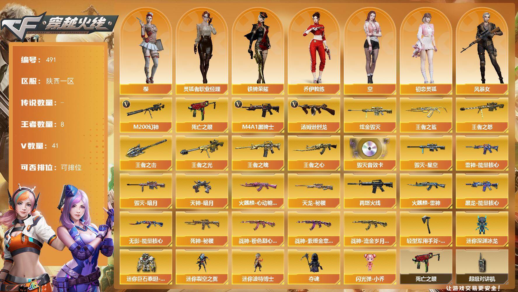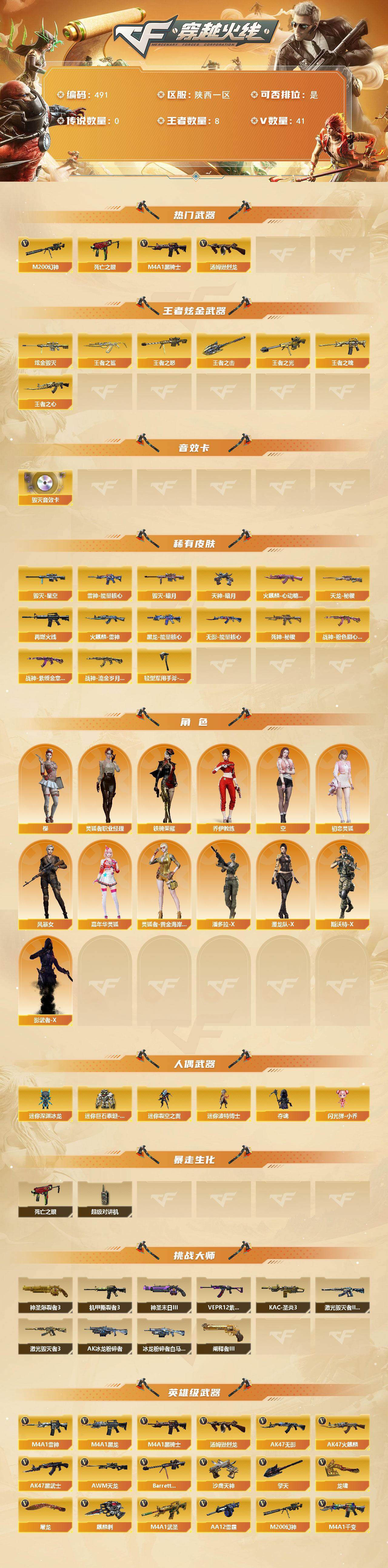 [14793538]陕西一区-41V-8王者-1炫金 【热门武器】:M200-幻神,死亡之眼,M4A1-黑骑士,汤姆逊-烈龙 【王者炫金武器】:王者之鲨,王者之魄,王者之心,王者之光,王者之怒,王者之击,炫金毁灭 【音效卡】:Barrett-毁灭音效卡 【皮肤】:雷神-能量核心,M4A1-再燃火线,火麒麟-雷神*2,火麒麟-心动糖果,毁灭-暗月,毁灭-星空,黑龙-能量核心,无影-能量核心,死神-秘银*2,战神-粉色甜心皮肤,战神-紫绶金章皮肤,战神-流金岁月皮肤,天龙-秘银,天神-暗月*2,轻型军用手斧-再燃火线 【角色】:樱,乔伊教练,空,初恋灵狐,风暴女,嘉年华灵狐,灵狐者-黄金海岸,灵狐者-职业经理,潘多拉-X,潜龙队-X,斯沃特-X,铁骑荣耀,影武者-X 【人偶武器】:迷你深渊冰龙,迷你裂空之翼*5,迷你波特博士,夺魂,闪光弹-小乔,迷你巨石泰坦-魔花研究所 【暴走生化】:死亡之眼,超级对讲机 【挑战大师】:神圣爆裂者III,AK47-冰龙粉碎者,冰龙粉碎者-白马银枪,激光毁灭者III-白马银枪,激光毁灭者III*2,机甲撕裂者III,KAC-圣炎切割者III,神圣爆裂者-末日III*2,阐释者III,VEPR-12-紫魔 【英雄级武器】:M4A1-千变,AK47-火麒麟*2,M4A1-黑龙,M4A1-雷神,M4A1-黑骑士,AK47-无影,AK47-黑武士,M4A1-武圣,AK-47-猩红传说,AK47-B-战神,王者冰魄-觉醒版,黑骑士-海王,AWM-天龙,Barrett-毁灭*2,M200-幻神,汤姆逊-烈龙,AA-12-雷霆,沙鹰-天神,屠龙,龙啸*2,麒麟刺-堕天神,擎天,麒麟刺,麒麟刺-百战金芒,王者之刺-觉醒版,高爆手雷-雷霆,高爆手雷-堕天神,高爆手雷-幻灵,闪光弹-雷霆,闪光弹-堕天神,烟雾弹-雷霆,烟雾弹-堕天神,M4A1-赤狱骑士 【道具】:BS战队炫彩背包,CFS限定背包,云山科技背包,超级背包,绿色巨人,灵魂忍者*2,迷雾幽灵,生化弹匣,夺命之镰,防化服*3,金色流光-枪王排位,萌萌小葵表情,C4-红龙,C4-沙漠,防弹头盔*4,防弹衣*6,C4工具钳*4,手雷包*3 【特殊枪械】:1黑骑士,1烈龙