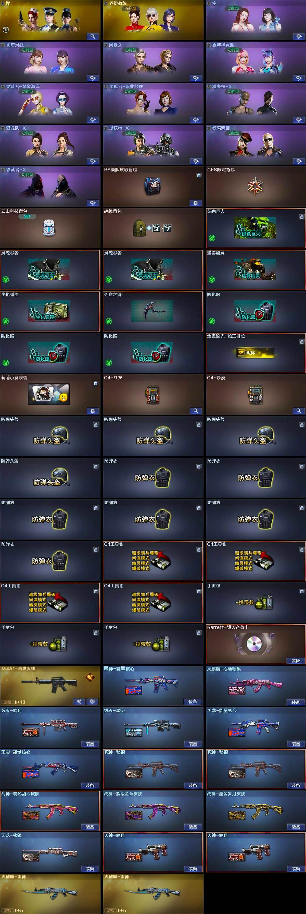 【道具】:BS战队炫彩背包,CFS限定背包,云山科技背包,超级背包,绿色巨人,灵魂忍者*2,迷雾幽灵,生化弹匣,夺命之镰,防化服*3,金色流光-枪王排位,萌萌小葵表情,C4-红龙,C4-沙漠,防弹头盔*4,防弹衣*6,C4工具钳*4,手雷包*3