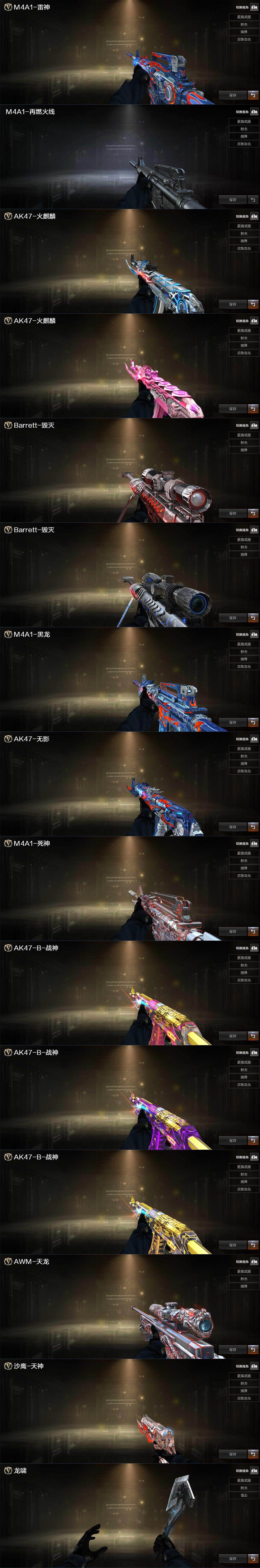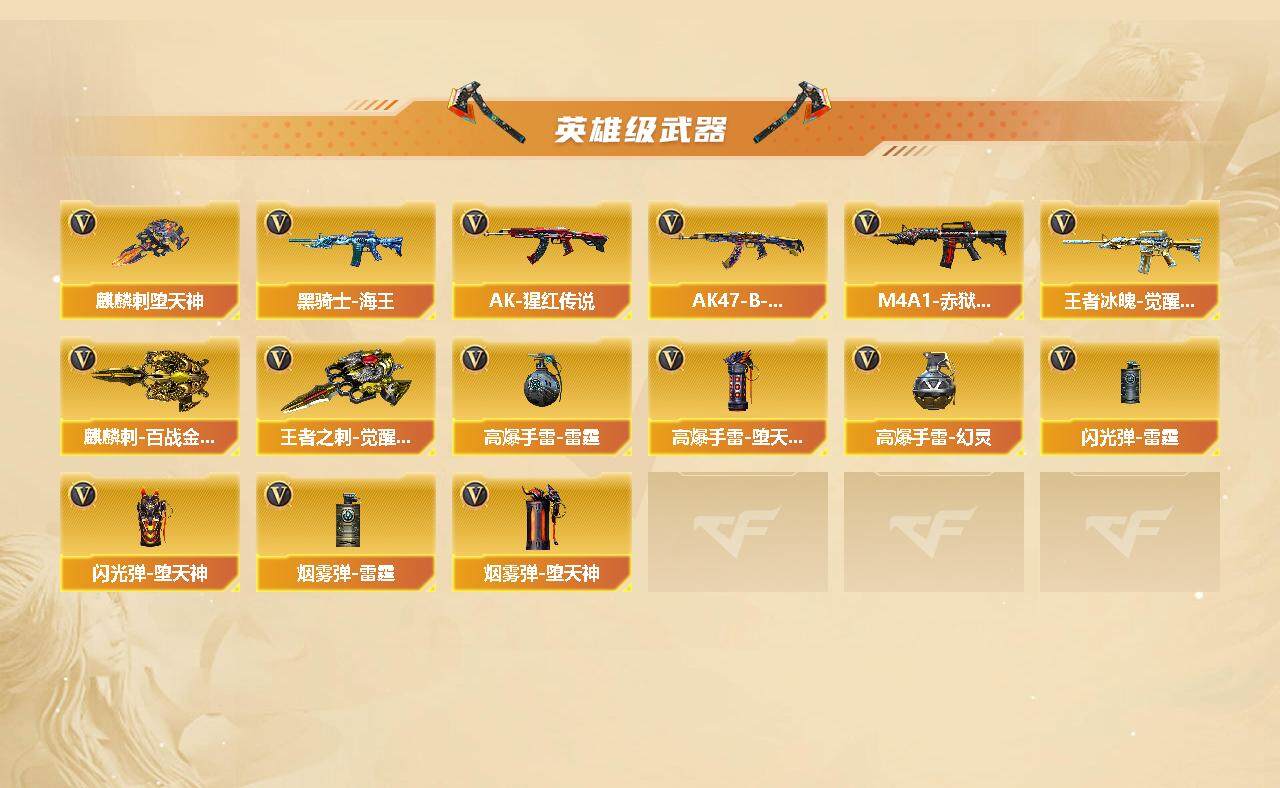 【英雄级武器】:M4A1-千变,AK47-火麒麟*2,M4A1-黑龙,M4A1-雷神,M4A1-黑骑士,AK47-无影,AK47-黑武士,M4A1-武圣,AK-47-猩红传说,AK47-B-战神,王者冰魄-觉醒版,黑骑士-海王,AWM-天龙,Barrett-毁灭*2,M200-幻神,汤姆逊-烈龙,AA-12-雷霆,沙鹰-天神,屠龙,龙啸*2,麒麟刺-堕天神,擎天,麒麟刺,麒麟刺-百战金芒,王者之刺-觉醒版,高爆手雷-雷霆,高爆手雷-堕天神,高爆手雷-幻灵,闪光弹-雷霆,闪光弹-堕天神,烟雾弹-雷霆,烟雾弹-堕天神,M4A1-赤狱骑士