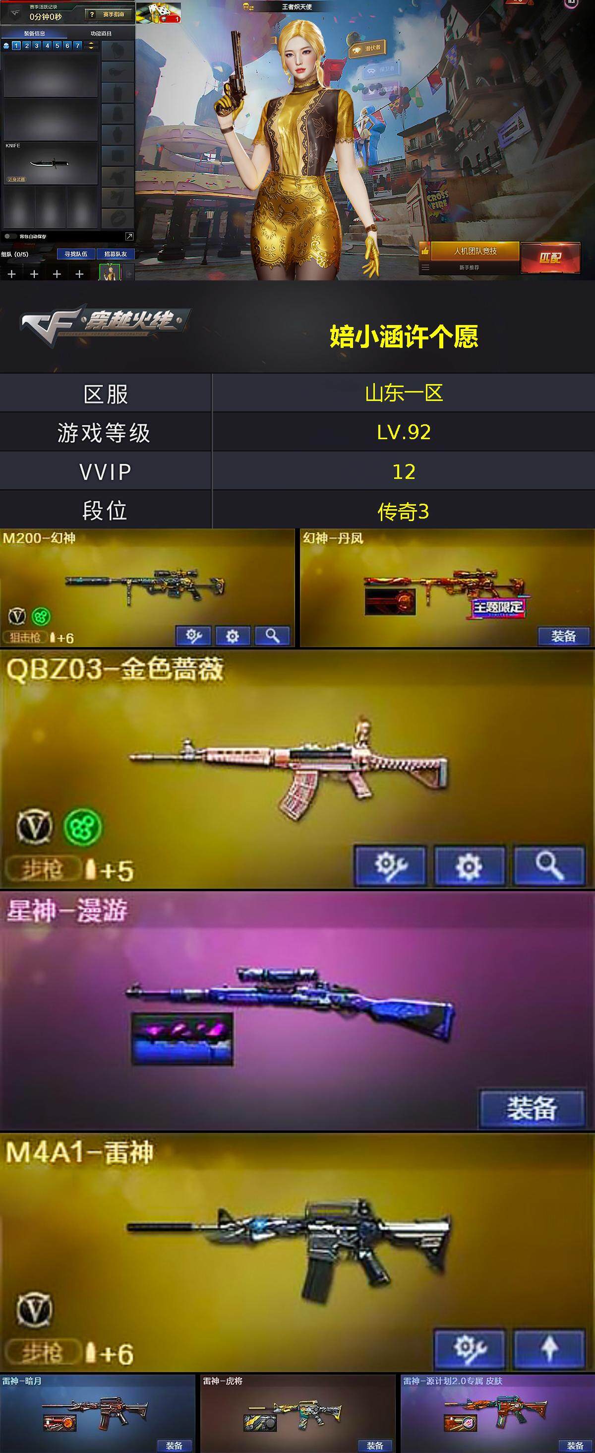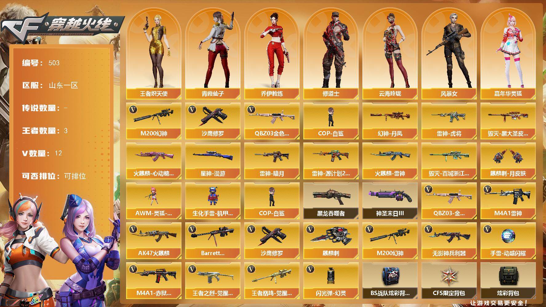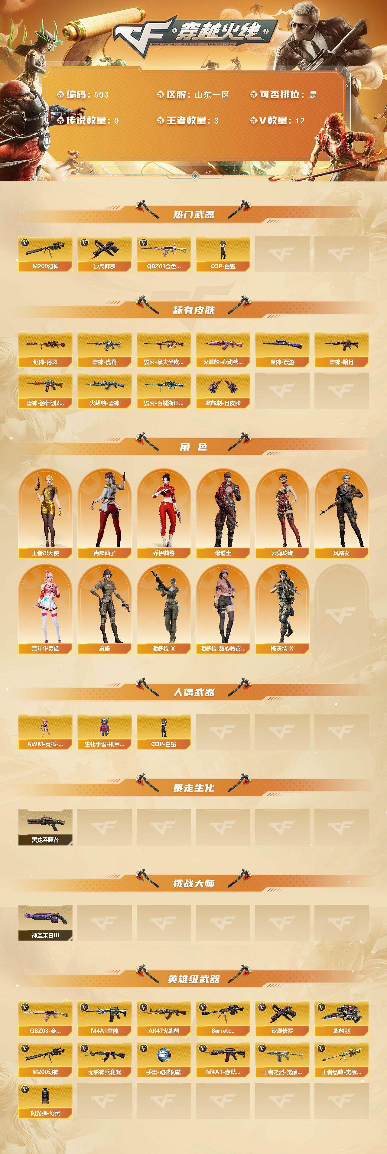 [14794730]山东一区-12V-3王者-0炫金 【热门武器】:QBZ03-金色蔷薇,M200-幻神,COP-白鲨,沙鹰-修罗 【皮肤】:幻神-丹凤,星神-漫游,雷神-暗月,雷神-虎将,雷神-源计划2.0专属 皮肤,火麒麟-雷神,火麒麟-心动糖果,毁灭-黑大圣皮肤,毁灭-百城浙江 皮肤,麒麟刺-月皮肤 【角色】:王者炽天使,乔伊教练,修道士,云海玲珑,风暴女,嘉年华灵狐,麻雀,潘多拉-X,潘多拉-甜心教官,青霞仙子,斯沃特-X 【人偶武器】:COP-白鲨,AWM-灵狐-15周年嘉年华,生化手雷-机甲核心*2 【暴走生化】:黑龙吞噬者 【挑战大师】:神圣爆裂者-末日III 【英雄级武器】:AK47-火麒麟*2,M4A1-雷神,无影-神兵利器,QBZ03-金色蔷薇,王者之烈-觉醒版,Barrett-毁灭,M200-幻神,王者凰鸣-觉醒版,沙鹰-修罗,麒麟刺,手雷-动感闪耀,闪光弹-幻灵,M4A1-赤狱骑士 【道具】:BS战队炫彩背包,CFS限定背包,炫彩背包,超级背包,女皇终结者-魔龙之吻,救世主-黑桃战神,绿色巨人,灵魂忍者,迷雾幽灵,夺命之镰,防化服*3,金色流光-枪王排位*2,星辰流光-枪王排位,巅峰赛先锋-金色流光,枪王排位28赛季金色流光,枪王排位29赛季金色流光,热带奇洋表情,EP战队名片,EP战队喷图,EP战队击杀图标,防弹头盔*3,防弹衣*3,C4工具钳*3,手雷包*3 【特殊枪械】: