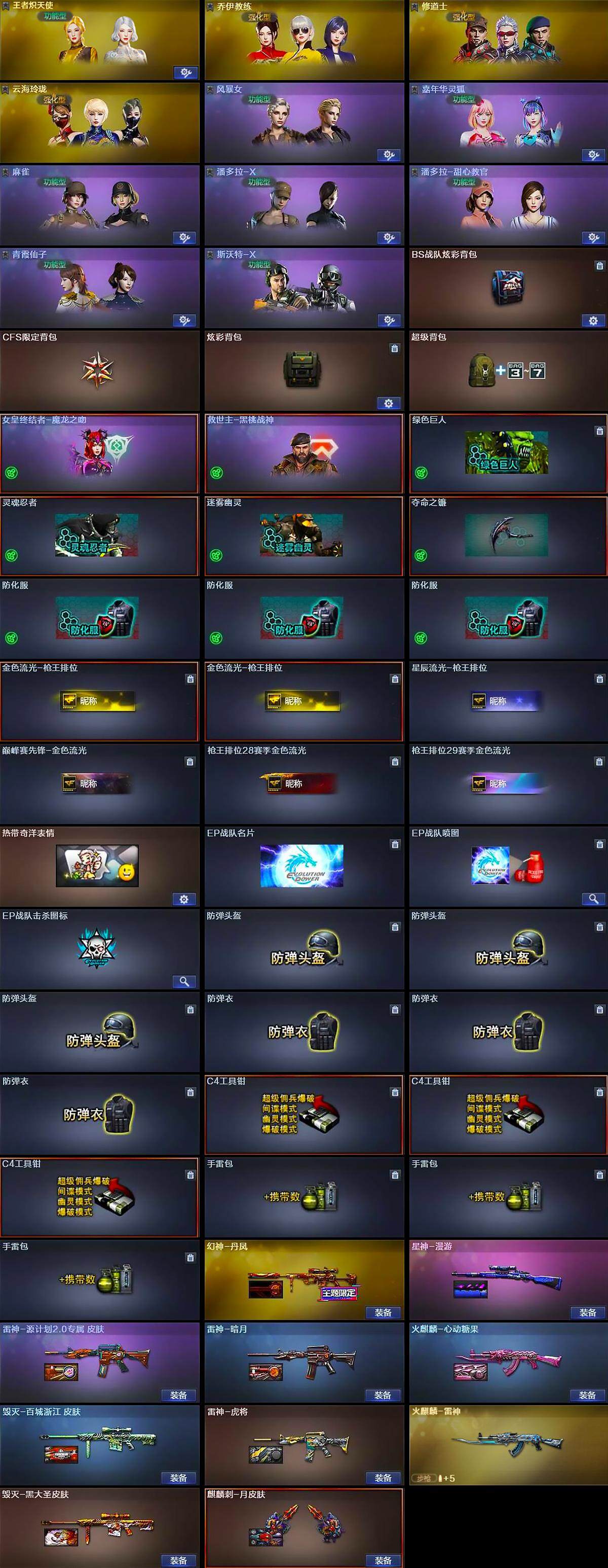 【道具】:BS战队炫彩背包,CFS限定背包,炫彩背包,超级背包,女皇终结者-魔龙之吻,救世主-黑桃战神,绿色巨人,灵魂忍者,迷雾幽灵,夺命之镰,防化服*3,金色流光-枪王排位*2,星辰流光-枪王排位,巅峰赛先锋-金色流光,枪王排位28赛季金色流光,枪王排位29赛季金色流光,热带奇洋表情,EP战队名片,EP战队喷图,EP战队击杀图标,防弹头盔*3,防弹衣*3,C4工具钳*3,手雷包*3
