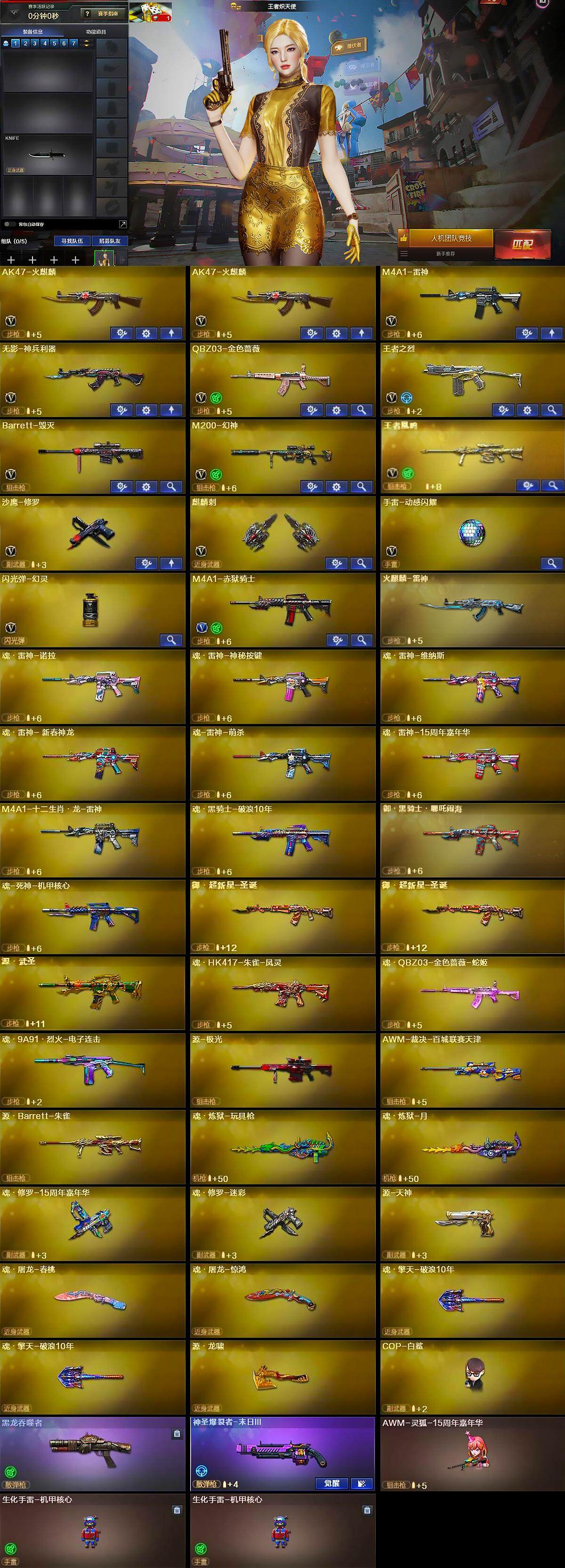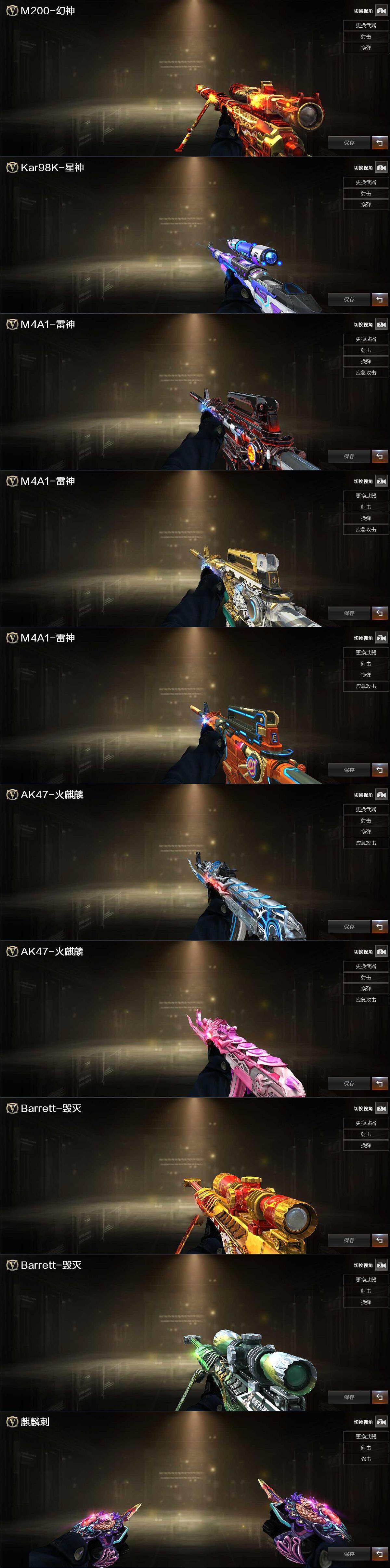 【英雄级武器】:AK47-火麒麟*2,M4A1-雷神,无影-神兵利器,QBZ03-金色蔷薇,王者之烈-觉醒版,Barrett-毁灭,M200-幻神,王者凰鸣-觉醒版,沙鹰-修罗,麒麟刺,手雷-动感闪耀,闪光弹-幻灵,M4A1-赤狱骑士