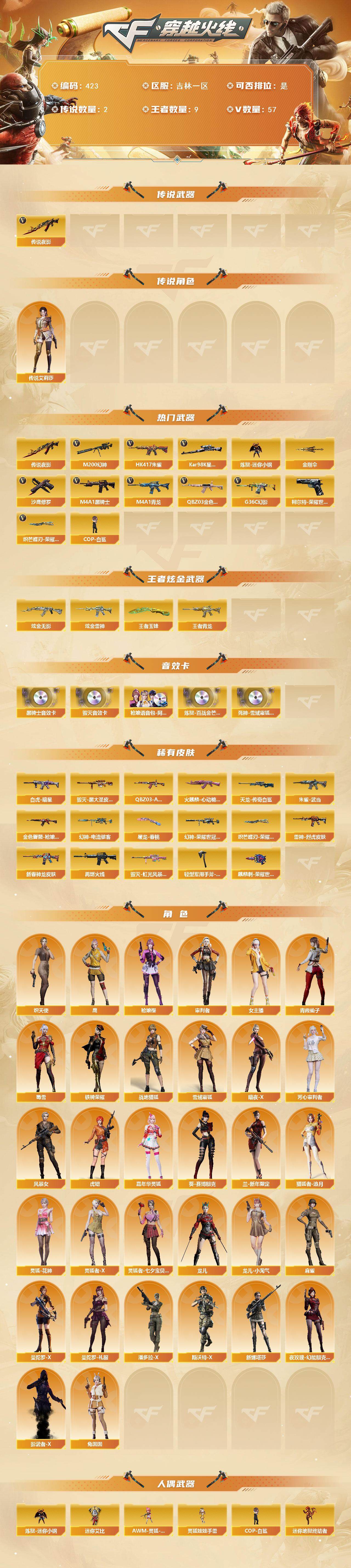 [14798409]吉林一区-57V-9王者-2炫金 【传说武器】:传说夜影 【传说角色】:传说艾莉莎 【热门武器】:传说夜影,G36C-幻影,QBZ03-金色蔷薇,HK417-朱雀,M4A1-青龙,M200-幻神,柯尔特-荣耀世冠白鲨2023*2,Kar98K-星神,炼狱-迷你小钢,M4A1-黑骑士,COP-白鲨*2,沙鹰-修罗*5,炽芒蝶刃-荣耀世冠白鲨2023 皮肤,金刚伞 【王者炫金武器】:王者青龙,王者玉锋,炫金无影,炫金雷神 【音效卡】:M4A1-黑骑士音效卡,Barrett-毁灭音效卡,枪娘语音包-阿敏,炼狱-百战金芒-庆典舞曲音效卡,死神-雪域霜狐-怀旧音效卡 【皮肤】:幻神-电流骇客 皮肤,幻神-荣耀世冠白鲨2023 皮肤,Scar Light-白虎-暗星,QBZ03-AG-CFPLS19冠军,金色蔷薇-枪娘阿敏 皮肤,雷神-烈虎皮肤,M4A1-雷神-新春神龙皮肤,M4A1-再燃火线,火麒麟-心动糖果,毁灭-黑大圣皮肤,毁灭-虹光风暴 皮肤,HK417-朱雀-武当,AWM-天龙-传奇白鲨,屠龙-春桃 皮肤,轻型军用手斧-再燃火线,麒麟刺-荣耀世冠白鲨,炽芒蝶刃-荣耀世冠白鲨2023 皮肤 【角色】:鹰,枪娘樱,审判者,战地猎狐,雪域霜狐,炽天使,暗夜-X,芳心审判者,风暴女,虎妞,嘉年华灵狐,葵-赛博朋克,兰-新年限定,猎狐者-追月,灵狐-花神,灵狐者-X,灵狐者-七夕宝贝,龙儿,龙儿-小淘气,麻雀,曼陀罗-X,曼陀罗-礼服,女主播,潘多拉-X,青霞仙子,斯沃特-X,蜀雪,铁骑荣耀,兔囡囡,新娜塔莎,夜玫瑰-幻能朋克,影武者-X 【人偶武器】:COP-白鲨*2,炼狱-迷你小钢,迷你救赎猎手,迷你地狱终结者,AWM-灵狐-15周年嘉年华,迷你艾比,灵狐娃娃手雷 【暴走生化】:超级对讲机 【挑战大师】:神圣爆裂者-末日III 【英雄级武器】:AK47-火麒麟*2,M4A1-黑龙,M4A1-雷神,M4A1-黑骑士,AK47-无影,AN94-超新星,AK47-机械迷城,M4A1-青龙,HK417-朱雀,QBZ03-天罚,无影-神兵利器,G36C-幻影,黑武士-锦绣游龙,死神-雪域霜狐,QBZ03-金色蔷薇,王者之势-觉醒版,王者冰魄-觉醒版,王者风势-觉醒版,白虎之魄-觉醒版,AWM-天龙,Barrett-毁灭,Barrett-极光,M200-幻神,Kar98K-星神,王者