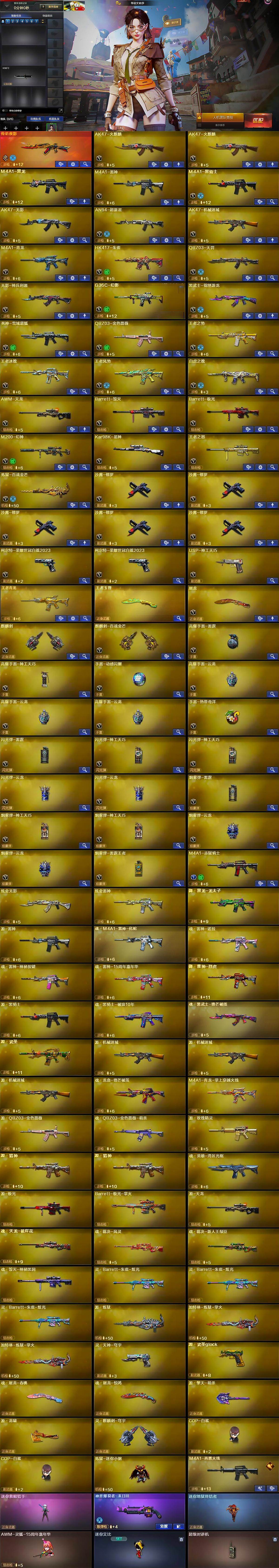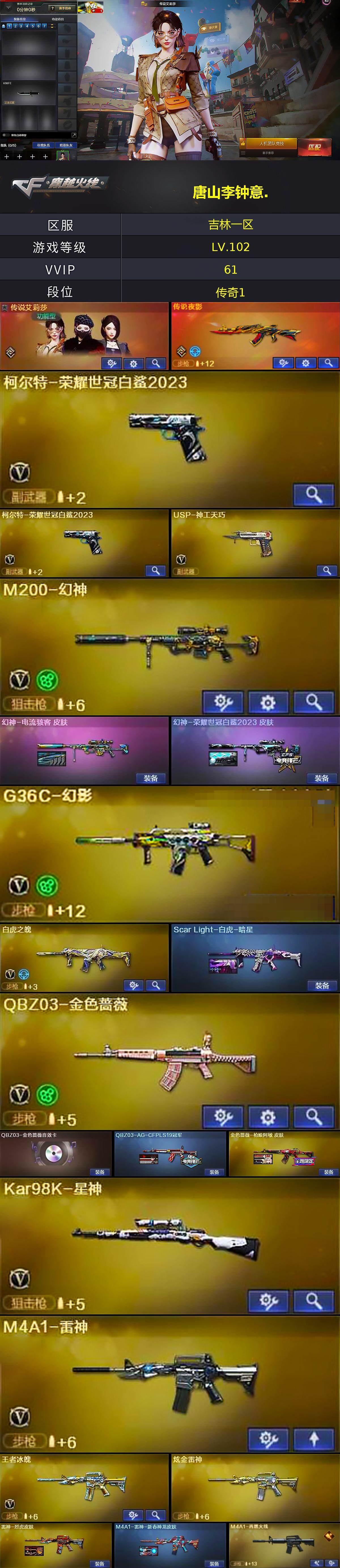 【热门武器】:传说夜影,G36C-幻影,QBZ03-金色蔷薇,HK417-朱雀,M4A1-青龙,M200-幻神,柯尔特-荣耀世冠白鲨2023*2,Kar98K-星神,炼狱-迷你小钢,M4A1-黑骑士,COP-白鲨*2,沙鹰-修罗*5,炽芒蝶刃-荣耀世冠白鲨2023 皮肤,金刚伞