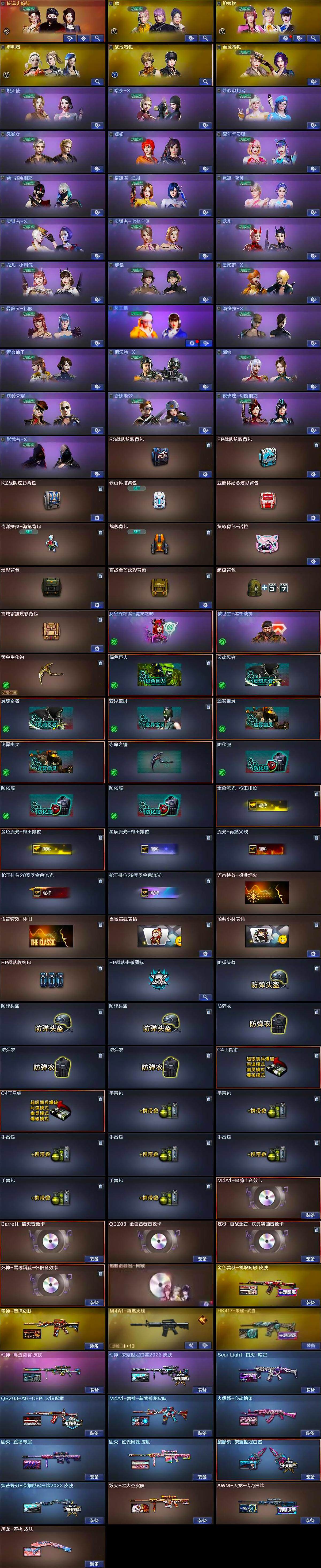 【皮肤】:幻神-电流骇客 皮肤,幻神-荣耀世冠白鲨2023 皮肤,Scar Light-白虎-暗星,QBZ03-AG-CFPLS19冠军,金色蔷薇-枪娘阿敏 皮肤,雷神-烈虎皮肤,M4A1-雷神-新春神龙皮肤,M4A1-再燃火线,火麒麟-心动糖果,毁灭-黑大圣皮肤,毁灭-虹光风暴 皮肤,HK417-朱雀-武当,AWM-天龙-传奇白鲨,屠龙-春桃 皮肤,轻型军用手斧-再燃火线,麒麟刺-荣耀世冠白鲨,炽芒蝶刃-荣耀世冠白鲨2023 皮肤