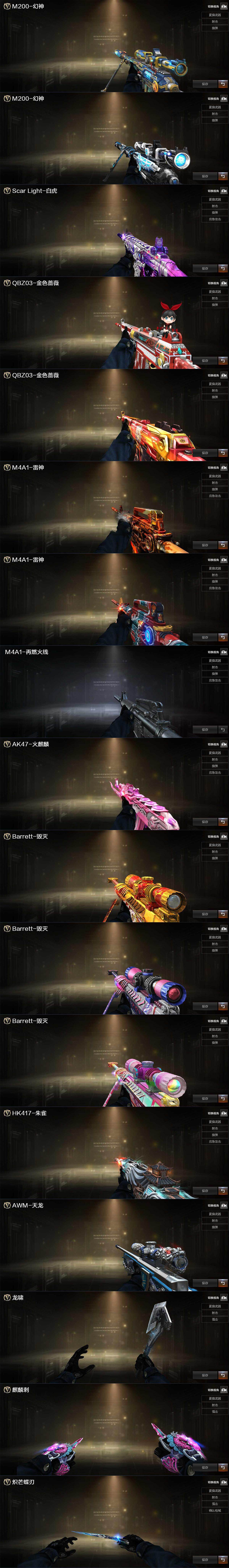 【英雄级武器】:AK47-火麒麟*2,M4A1-黑龙,M4A1-雷神,M4A1-黑骑士,AK47-无影,AN94-超新星,AK47-机械迷城,M4A1-青龙,HK417-朱雀,QBZ03-天罚,无影-神兵利器,G36C-幻影,黑武士-锦绣游龙,死神-雪域霜狐,QBZ03-金色蔷薇,王者之势-觉醒版,王者冰魄-觉醒版,王者风势-觉醒版,白虎之魄-觉醒版,AWM-天龙,Barrett-毁灭,Barrett-极光,M200-幻神,Kar98K-星神,王者