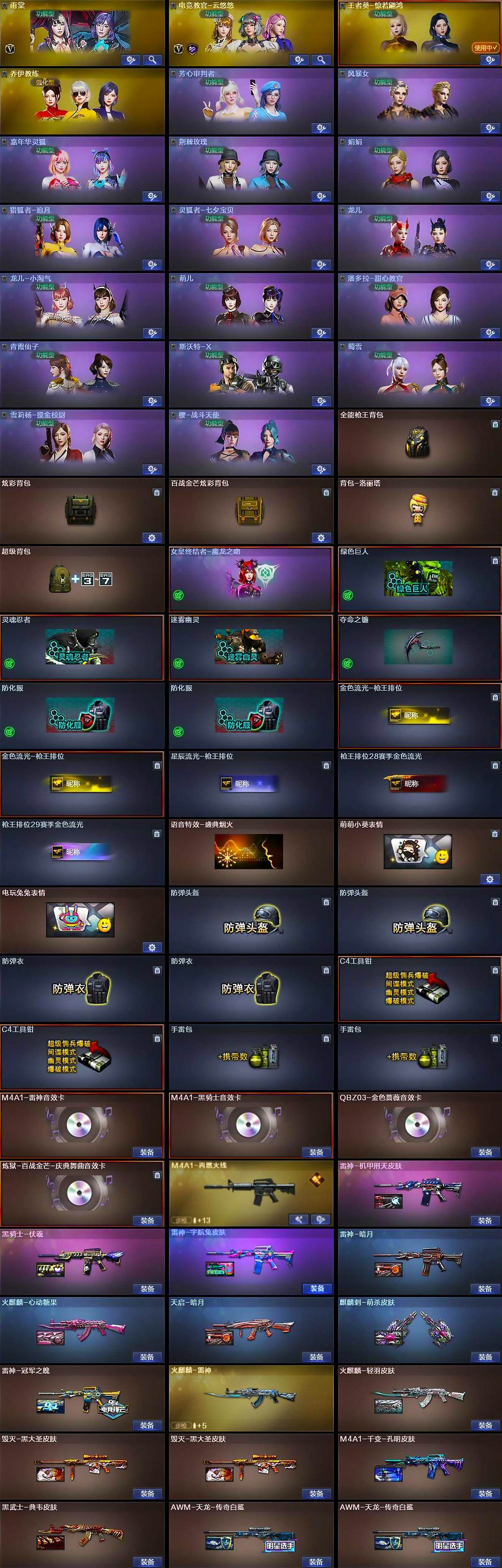 【道具】:全能枪王背包,炫彩背包,百战金芒炫彩背包,背包-洛丽塔,超级背包,女皇终结者-魔龙之吻,绿色巨人,灵魂忍者,迷雾幽灵,夺命之镰,防化服*2,金色流光-枪王排位*2,星辰流光-枪王排位,枪王排位28赛季金色流光,枪王排位
