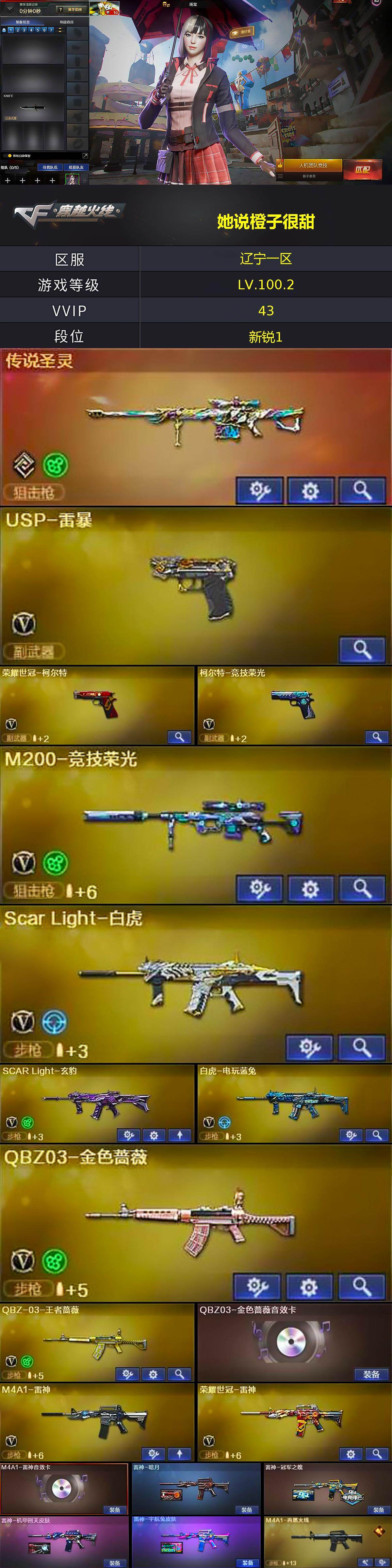[14798597]辽宁一区-42V-2王者-1炫金 【传说武器】:传说圣灵 【热门武器】:传说圣灵,QBZ03-金色蔷薇,Scar Light-白虎,M200-竞技荣光,荣耀世冠-火麒麟,荣耀世冠-雷神,白虎-电玩蓝兔,荣耀世冠-柯尔特,M4A1-黑骑士,斯泰尔-蝴蝶,USP-雷暴 【王者炫金武器】:炫金毁灭 【音效卡】:M4A1-雷神音效卡,M4A1-黑骑士音效卡,炼狱-百战金芒-庆典舞曲音效卡 【皮肤】:雷神-暗月,雷神-冠军之魄,雷神-机甲刑天皮肤,雷神-宇航兔皮肤,M4A1-再燃火线,火麒麟-雷神,火麒麟-轻羽皮肤,火麒麟-心动糖果,毁灭-黑大圣皮肤*2,M4A1-千变-孔明皮肤,黑骑士-伏羲,黑武士-典韦皮肤,天启-暗月,AK47-B-常胜将军-曹操,AK47-B-常胜将军-刘备,AWM-天龙-传奇白鲨*2,轻型军用手斧-再燃火线,麒麟刺-萌杀皮肤 【角色】:雨棠,电竞教官-云悠悠,王者葵-惊若翩鸿,乔伊教练,芳心审判者,风暴女,嘉年华灵狐,荆棘玫瑰,娟娟,猎狐者-追月,灵狐者-七夕宝贝,龙儿,龙儿-小淘气,萌儿,潘多拉-甜心教官,青霞仙子,斯沃特-X,蜀雪,兔囡囡,雪莉杨-摸金校尉,樱-战斗天使 【人偶武器】:斯泰尔-蝴蝶,AWM-灵狐-15周年嘉年华,海滩汪汪-巴雷特,迷你裂空之翼,生化手雷-机甲核心,迷你超能女侍 【挑战大师】:冰龙粉碎者-白马银枪*2,激光毁灭者III-白马银枪 【英雄级武器】:AK47-火麒麟*2,M4A1-黑龙,M4A1-雷神,M4A1-黑骑士,Scar Light-白虎,无影-神兵利器,SCAR Light-玄豹,QBZ03-金色蔷薇,AK-47-猩红传说,QBZ-03-王者蔷薇-觉醒版,白虎-电玩蓝兔,荣耀世冠-火麒麟,荣耀世冠-雷神,Barrett-毁灭,M200-竞技荣光,炼狱-百战金芒,USP-雷暴,荣耀世冠-柯尔特,柯尔特-竞技荣光,天神-动感闪耀,屠龙,麒麟刺,擎天-竞技荣光,麒麟刺-百战金芒,丛林匕首-玄豹,高爆手雷-竞技荣光*2,手雷-动感闪耀,闪光弹-竞技荣光*2,烟雾弹-竞技荣光*3,烟雾弹-玄豹 【道具】:全能枪王背包,炫彩背包,百战金芒炫彩背包,背包-洛丽塔,超级背包,女皇终结者-魔龙之吻,绿色巨人,灵魂忍者,迷雾幽灵,夺命之镰,防化服*2,金色流光-枪王排位*2,星辰流光-枪王排位,枪王排位28赛季金色流光,枪王排位