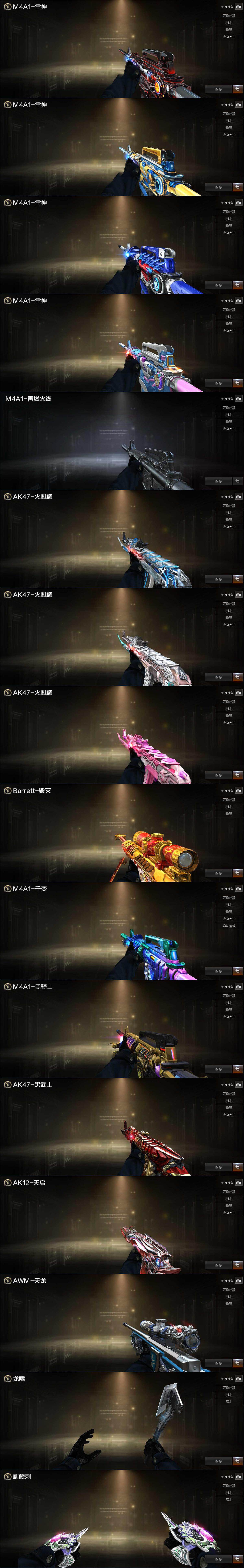 【皮肤】:雷神-暗月,雷神-冠军之魄,雷神-机甲刑天皮肤,雷神-宇航兔皮肤,M4A1-再燃火线,火麒麟-雷神,火麒麟-轻羽皮肤,火麒麟-心动糖果,毁灭-黑大圣皮肤*2,M4A1-千变-孔明皮肤,黑骑士-伏羲,黑武士-典韦皮肤,天启-暗月,AK47-B-常胜将军-曹操,AK47-B-常胜将军-刘备,AWM-天龙-传奇白鲨*2,轻型军用手斧-再燃火线,麒麟刺-萌杀皮肤