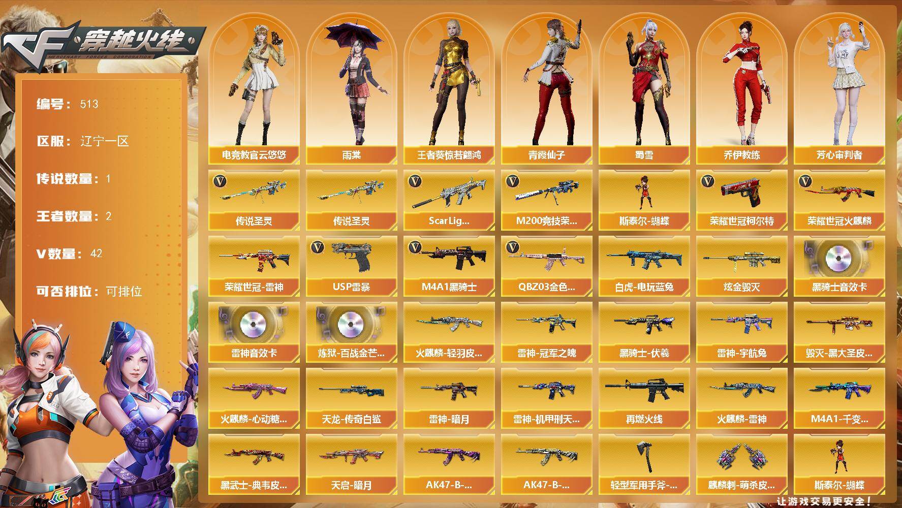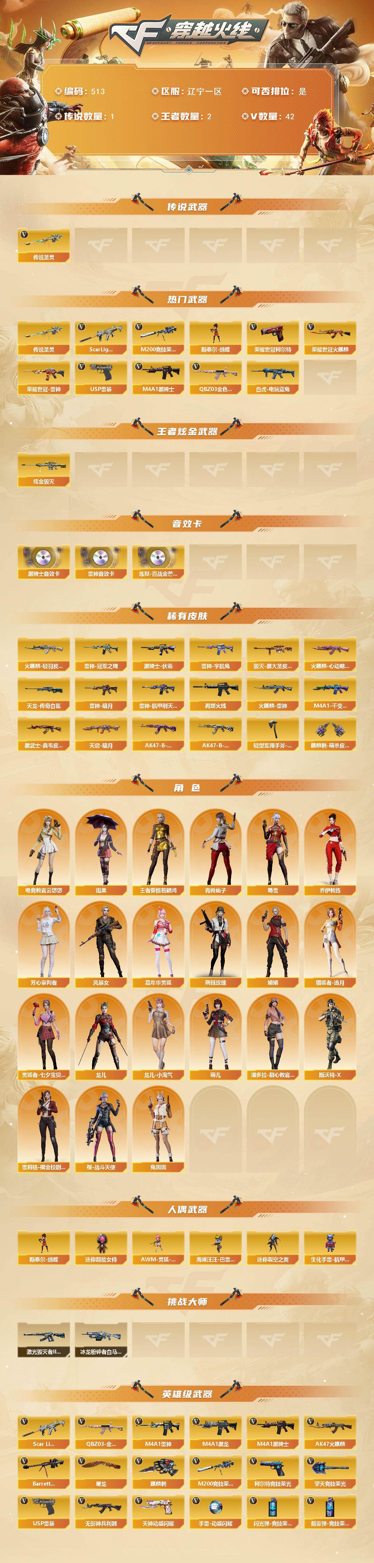 - [12401828]【商品标题】:南方大区-38V-4王者-1炫金 【热门武器】:QBZ03-金色蔷薇,HK417-朱雀,M200-幻神,死亡之眼,Kar98K-星神,M4A1-黑骑士,沙鹰-修罗 【王者炫金武器】:炫金天龙,王者之势,王者之武 【音效卡】:M4A1-雷神音效卡,Barrett-毁灭音效卡 【稀有皮肤】:雷神-能量核心,火麒麟-平天大圣,黑骑士-暗月,毁灭-暗月,毁灭-星空,AWM-天龙-传奇白鲨,M200-庆典-CFS 2021*2,AWM-CFS 2020 【角色】:蜀雪,魅影,青霞仙子 【人偶武器】:AWM-灵狐-15周年嘉年华,迷你深渊冰龙,迷你牛牛,生化手雷-机甲核心,深渊终结者手雷 【暴走生化】:死亡之眼 【挑战大师】:神圣爆裂者-末日III,阐释者III,激光毁灭者III,VEPR-12-金魔,AK47-冰龙粉碎者 【英雄级武器】:马来剑-夜魔,斩神刀-雷暴,QBZ03-金色蔷薇,HK417-朱雀,无影-神兵利器,M4A1-雷神,M4A1-黑龙,M4A1-黑骑士,AK47-无影,AK47-火麒麟,Barrett-毁灭,Barrett-极光,AWM-裁决,Kar98K-星神,M200-幻神,黑武士-锦绣游龙,黑骑士-海王*3,AK-47-猩红传说,沙鹰-天神*2,沙鹰-修罗,麒麟刺,擎天,龙啸,屠龙*2 【特殊枪械】:1黑骑士,