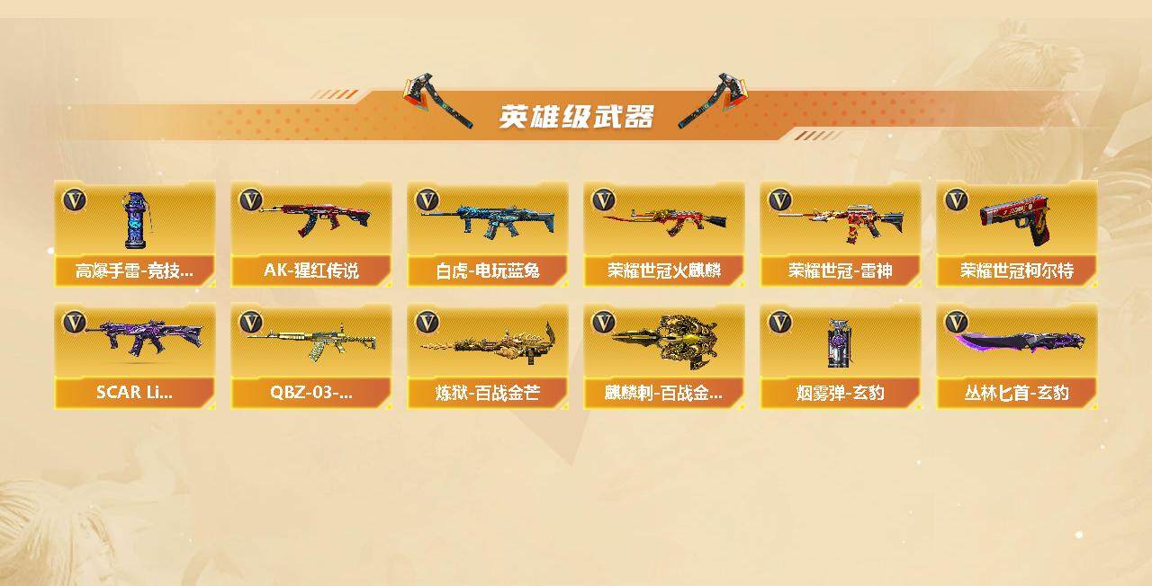 【英雄级武器】:AK47-火麒麟*2,M4A1-黑龙,M4A1-雷神,M4A1-黑骑士,Scar Light-白虎,无影-神兵利器,SCAR Light-玄豹,QBZ03-金色蔷薇,AK-47-猩红传说,QBZ-03-王者蔷薇-觉醒版,白虎-电玩蓝兔,荣耀世冠-火麒麟,荣耀世冠-雷神,Barrett-毁灭,M200-竞技荣光,炼狱-百战金芒,USP-雷暴,荣耀世冠-柯尔特,柯尔特-竞技荣光,天神-动感闪耀,屠龙,麒麟刺,擎天-竞技荣光,麒麟刺-百战金芒,丛林匕首-玄豹,高爆手雷-竞技荣光*2,手雷-动感闪耀,闪光弹-竞技荣光*2,烟雾弹-竞技荣光*3,烟雾弹-玄豹
