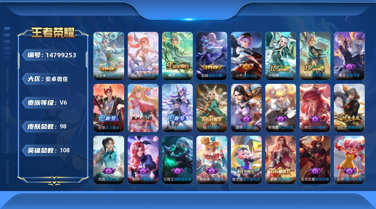 - [11883975]V8 1典藏 1珍品传说 17传说 125英雄 316皮肤 可修改实名 优质装备:鸣剑·曳影,怪盗基德,黄金狮子座,冠军飞将,久胜战神,云霓雀翎,末日机甲-孙尚香(绿蚂蚱),地狱火,零号·赤焰,地狱之眼 传说皮:乘龙·淬吴钩(孙策年限),死亡执政官,九山相柳,幻光神枪 珍宝阁皮:妄想食味,蔷薇恋人,玩趣恶龙 限定皮:愿照·九州拓(澜年限),逐霄战戟,鸣野蒿,白虎志(电光耗子),时雨天司(水龙头),神威(电光马子),飞衡(韩信年限),瑞麟志(木兰年限),遇见飞天,高山流水,五谷丰年,青龙志(铠年限),梁祝,天狼狩猎者,岱宗(典韦年限),李小龙,孙行者,猪悟能 史诗皮:器灵·浮梦炉,化蝶舞,星界战将,龙之律动,百相守梦-周瑜,茶境仙,破空之剑,蒙犽顽岩魄,蔬乡物语(鲁班七号),百相守梦-百里守约,百相守梦-黄忠,紫霞仙子,苍穹之光,电玩小子(小书包),特工魅影,千年之狐,江河有灵,雪夜绮愿(周瑜),百解令(蒙犽),高渐离燃音魔法,蒙恬荣光圣徽,冰冠公主,青蛇,偶像歌手,电玩·爆裂旋风,百相守梦(刘备),暗夜猫娘,末日机甲-吕布,猫狗日记-孙策,乱世虎臣,节奏热浪,修罗,女仆咖啡,摇滚巨星,水果甜心,星夜王子,心灵骇客,功夫厨神,德古拉伯爵,暗隐猎兽者,幽灵船长,鬼剑武藏,心灵战警,乐园奇幻夜,天秀·启明,舞动绿茵,地狱岩魂,纤云弄巧,拒霜思,乘风破浪,逐浪之夏,水晶猎龙者,曙光守护者,箭羽风息,金属风暴,原初追逐者,圣诞恋歌,鹰眼统帅,魅力维加斯,黎明之约,赏金猎手,无心,未来纪元-赵云
