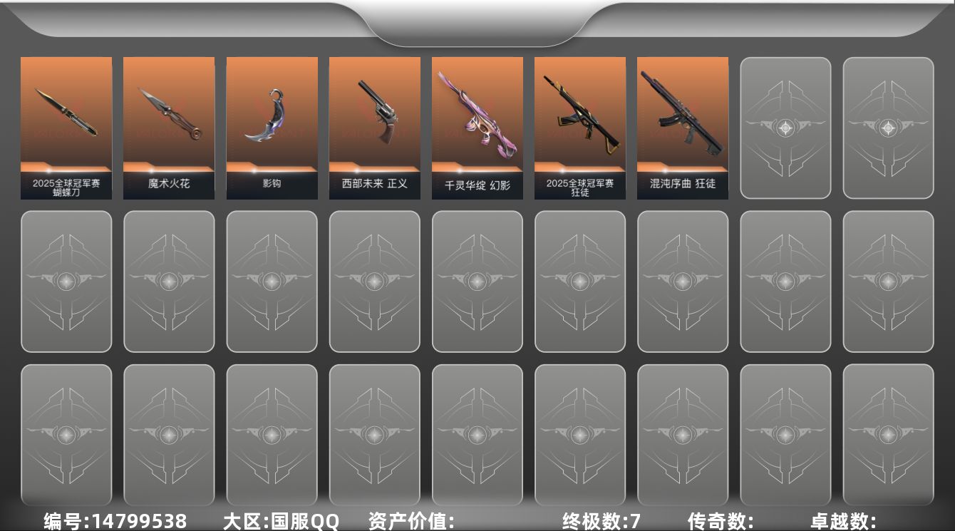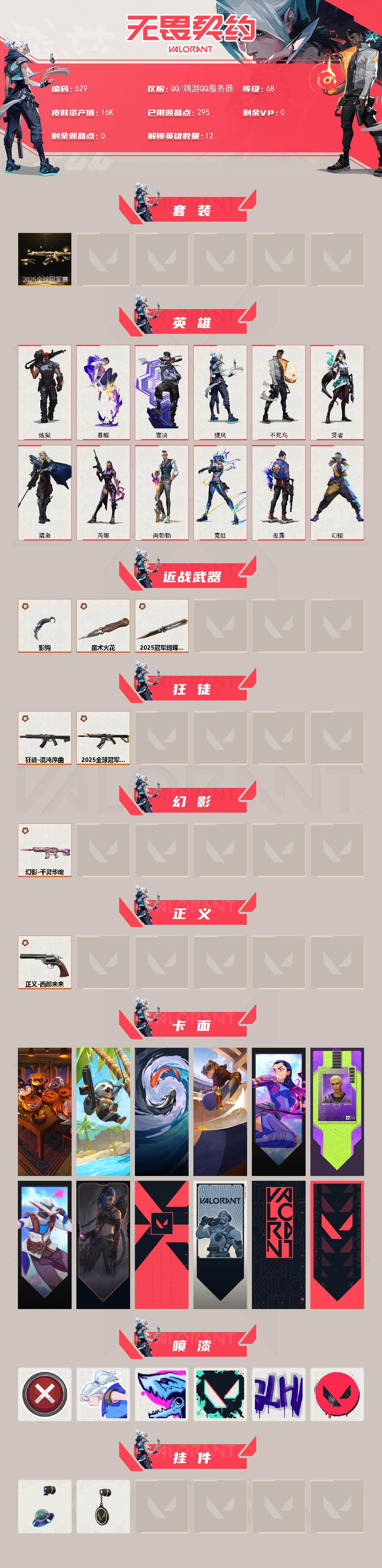 [14799538]【套装】:2025全球冠军赛套装 【英雄】:幻棱,炼狱,暮蝶,壹决,捷风,不死鸟,贤者,猎枭,芮娜,尚勃勒,霓虹,夜露 【近战 武器】:近战武器-2025全球冠军赛 蝴蝶刀,近战武器-魔术火花,近战武器-影钩,近战武器-魔术火花 【狂徒】:狂徒-2025全球冠军赛,狂徒-混沌序曲 【幻影】:幻影-千灵华绽 【正义】:正义-西部未来 【卡面】:南瓜盛典 卡面,树懒大作战 卡面,红鳞松叶 卡面,Clutch 卡面,无畏契约GO!第一卷:芮娜 卡面,盖可工牌 卡面,无畏契约GO!第一卷:零 卡面,《双城之战》金克丝 卡面,代号红色 卡面,新兵报到 卡面,V契约 卡面,无畏契约 卡面 【喷漆】:买装还是存钱 喷漆,无畏契约GO!第一卷:捷风 喷漆,暴走萝莉 喷漆,胜利属于无畏契约 喷漆,GLHF 喷漆,无畏契约 喷漆 【挂饰】:天外飞客 挂饰,无畏契约 纪念币 挂饰