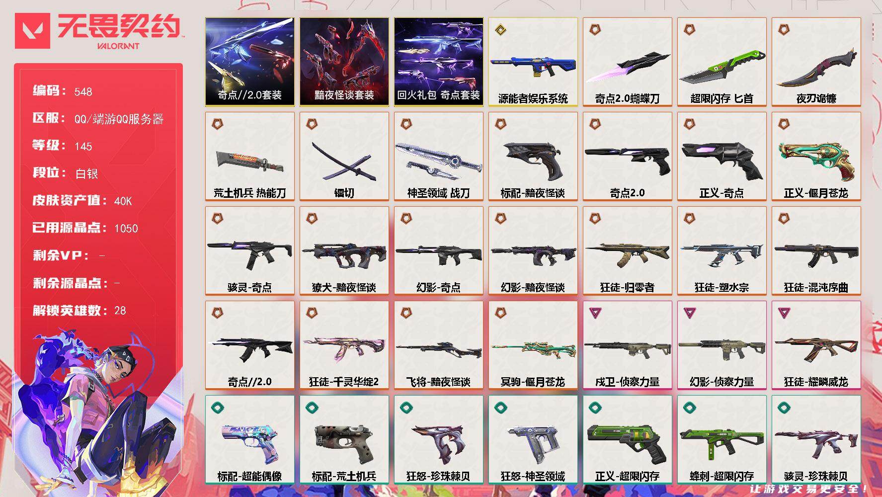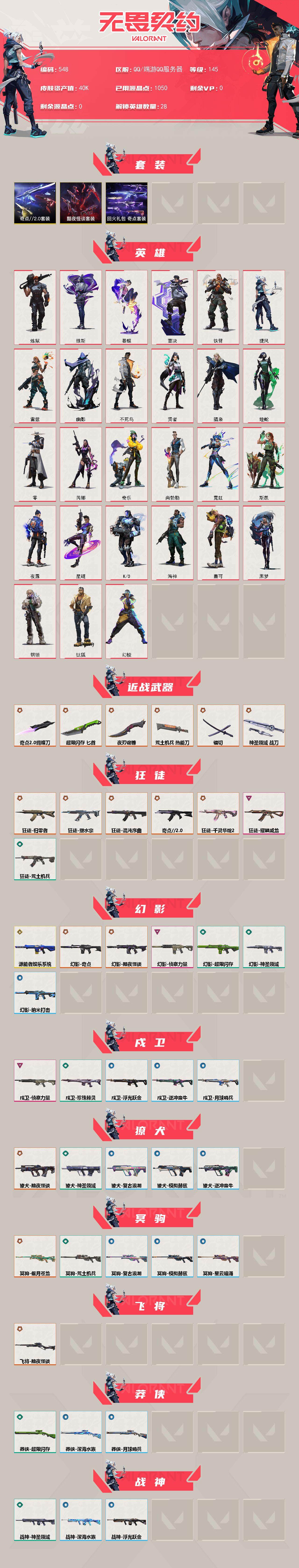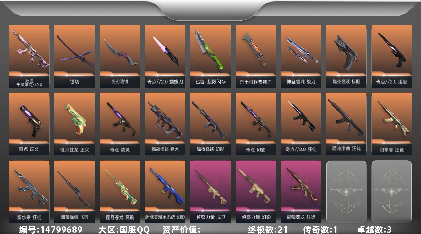 [14799689]【套装】:奇点//2.0套装,黯夜怪谈套装,回火礼包:奇点套装 【英雄】:幻棱,炼狱,维斯,暮蝶,钛狐,壹决,铁臂,捷风,雷兹,幽影,不死鸟,贤者,猎枭,蝰蛇,零,芮娜,奇乐,尚勃勒,霓虹,斯凯,夜露,星礈,K/O,海神,盖可,黑梦,钢锁 【近战 武器】:近战武器-奇点//2.0 蝴蝶刀,近战武器-镭切,近战武器-超限闪存 匕首,近战武器-荒土机兵 热能刀,近战武器-夜刃诡镰,近战武器-神圣领域 战刀 【狂徒】:狂徒-归零者,狂徒-混沌序曲,狂徒-奇点//2.0,狂徒-塑水宗,狂徒-千灵华绽//2.0,狂徒-耀鳞威龙,狂徒-荒土机兵 【幻影】:幻影-源能者娱乐系统,幻影-黯夜怪谈,幻影-奇点,幻影-侦察力量,幻影-超限闪存,幻影-神圣领域,幻影-纳米打击 【戍卫】:戍卫-侦察力量,戍卫-珍珠棘贝,戍卫-浮光跃金,戍卫-逆冲蛮牛,戍卫-月球哨兵 【獠犬】:獠犬-黯夜怪谈,獠犬-神圣领域,獠犬-复古浪潮,獠犬-模拟赫兹,獠犬-逆冲蛮牛 【冥驹】:冥驹-偃月苍龙,冥驹-荒土机兵,冥驹-复古浪潮,冥驹-模拟赫兹,冥驹-星云暗涌 【飞将】:飞将-黯夜怪谈 【莽侠】:莽侠-超限闪存,莽侠-深海水族,莽侠-月球哨兵 【战神】:战神-神圣领域,战神-浮光跃金,战神-深海水族 【奥丁】:奥丁-纳米打击 【判官】:判官-纳米打击x 【雄鹿】:雄鹿-复古浪潮,雄鹿-模拟赫兹,雄鹿-逆冲蛮牛,雄鹿-月球哨兵 【骇灵】:骇灵-奇点,骇灵-荒土机兵,骇灵-珍珠棘贝,骇灵-浮光跃金,骇灵-星云暗涌 【蜂刺】:蜂刺-超限闪存,蜂刺-深海水族,蜂刺-星云暗涌 【标配】:标配-黯夜怪谈,标配-超能偶像,标配-荒土机兵,标配-浮光跃金 【正义】:正义-奇点,正义-偃月苍龙,正义-超限闪存,正义-纳米打击,正义-戍卫者,正义-月球哨兵 【鬼魅】:鬼魅-奇点//2.0,鬼魅-模拟赫兹,鬼魅-星云暗涌 【狂怒】:狂怒-珍珠棘贝,狂怒-神圣领域,狂怒-逆冲蛮牛 【短炮】:短炮-深海水族 【卡面】:终章:激斗汉堡 卡面,进入射程 卡面,分崩离析 卡面,纳米打击 卡面,抑制技术 卡面,激斗汉堡 卡面,瓦娃脸雪糕 P2 卡面,从黄昏到黎明 卡面,荒土机兵 卡面,银弹猎手 卡面,逆冲蛮牛 卡面,《双城之战》拥抱 卡面,精灵大战 卡面,欢迎来到底城 卡面,南瓜盛典 卡面,唱片的故事 卡面,钢弓与箭弦 卡面,无畏契约:暮