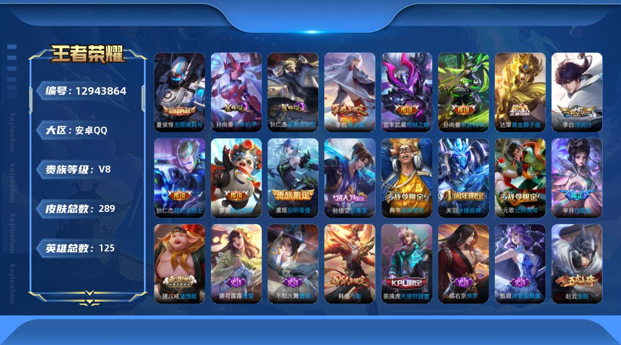 [12943864]MQ057-有二次-安卓Q-V8-125英雄-289皮肤-1典藏-8传说-77史诗