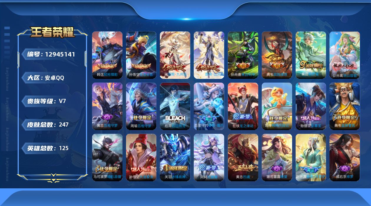 [12945141]【特价急出/详情看图】:安卓Q-V7-至尊星耀III段位-124英雄-247皮肤-2典藏-5传说-63史诗