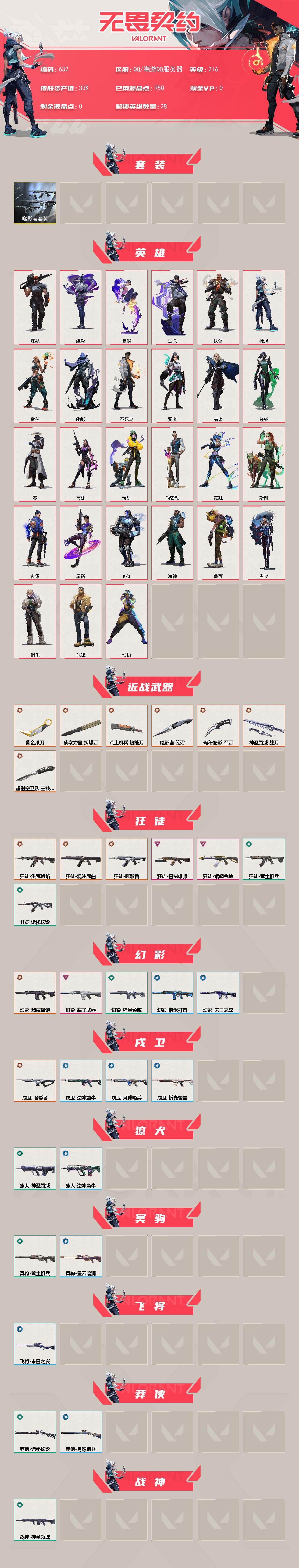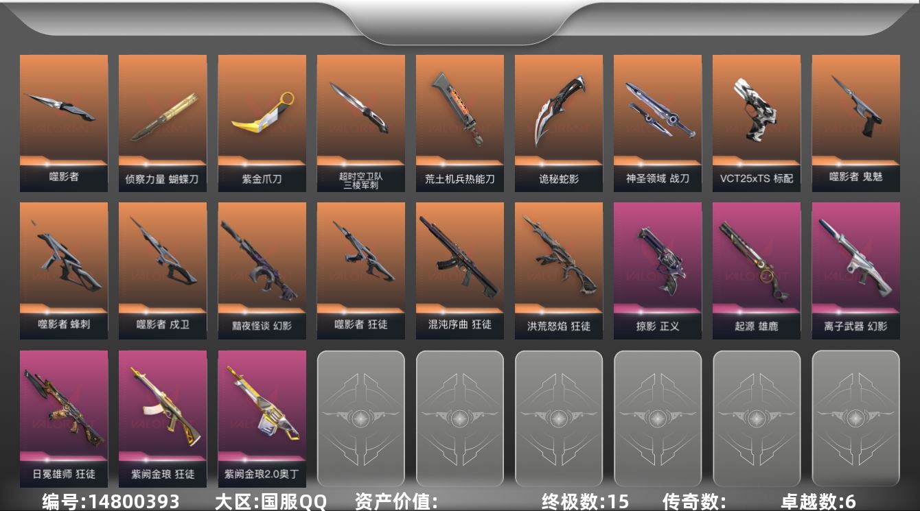 [14800393]【套装】:噬影者套装 【英雄】:幻棱,炼狱,维斯,暮蝶,钛狐,壹决,铁臂,捷风,雷兹,幽影,不死鸟,贤者,猎枭,蝰蛇,零,芮娜,奇乐,尚勃勒,霓虹,斯凯,夜露,星礈,K/O,海神,盖可,黑梦,钢锁 【近战 武器】:近战武器-超时空卫队 三棱军刺,近战武器-侦察力量 蝴蝶刀,近战武器-紫金爪刀,近战武器-噬影者 簇刃,近战武器-荒土机兵 热能刀,近战武器-诡秘蛇影 军刀,近战武器-神圣领域 战刀 【狂徒】:狂徒-洪荒怒焰,狂徒-混沌序曲,狂徒-噬影者,狂徒-日冕雄师,狂徒-紫阙金琅,狂徒-荒土机兵,狂徒-诡秘蛇影 【幻影】:幻影-黯夜怪谈,幻影-离子武器,幻影-神圣领域,幻影-纳米打击,幻影-末日之翼 【戍卫】:戍卫-噬影者,戍卫-逆冲蛮牛,戍卫-月球哨兵,戍卫-折光棱晶 【獠犬】:獠犬-神圣领域,獠犬-逆冲蛮牛 【冥驹】:冥驹-荒土机兵,冥驹-星云暗涌 【飞将】:飞将-末日之翼 【莽侠】:莽侠-诡秘蛇影,莽侠-月球哨兵 【战神】:战神-神圣领域 【奥丁】:奥丁-紫阙金琅//2.0,奥丁-纳米打击,奥丁-末日之翼 【判官】:判官-诡秘蛇影,判官-纳米打击x 【雄鹿】:雄鹿-起源,雄鹿-逆冲蛮牛,雄鹿-月球哨兵 【骇灵】:骇灵-荒土机兵,骇灵-无限竞技,骇灵-星云暗涌 【蜂刺】:蜂刺-噬影者,蜂刺-星云暗涌,蜂刺-折光棱晶 【标配】:标配-荒土机兵,标配-折光棱晶 【VCT手枪】:标配-VCT25 x TS 【正义】:正义-掠影,正义-纳米打击,正义-月球哨兵 【鬼魅】:鬼魅-噬影者,鬼魅-诡秘蛇影,鬼魅-扑棱扑棱,鬼魅-星云暗涌 【狂怒】:狂怒-神圣领域,狂怒-逆冲蛮牛 【短炮】:短炮-末日之翼 【卡面】:终章:激斗汉堡 卡面,进入射程 卡面,分崩离析 卡面,纳米打击 卡面,抑制技术 卡面,激斗汉堡 卡面,瓦娃脸雪糕 P2 卡面,从黄昏到黎明 卡面,荒土机兵 卡面,银弹猎手 卡面,逆冲蛮牛 卡面,《双城之战》拥抱 卡面,精灵大战 卡面,欢迎来到底城 卡面,南瓜盛典 卡面,无畏契约:暮蝶 卡面,修车达人 卡面,正义的化身 卡面,红鳞松叶 卡面,Clutch 卡面,暮蝶工牌 卡面,无畏契约:蝰蛇 卡面,无畏契约GO!第一卷:芮娜 卡面,盖可工牌 卡面,无畏契约GO!第一卷:零 卡面,代号红色 卡面,新兵报到 卡面,V契约 卡面,无畏契约 卡面 【喷漆】:小小心意 喷漆,