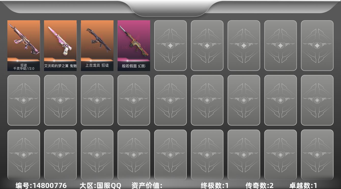 [14800776]【英雄】:炼狱,暮蝶,捷风,不死鸟,贤者,猎枭,尚勃勒,霓虹,黑梦 【狂徒】:狂徒-上古龙炎,狂徒-千灵华绽//2.0 【幻影】:幻影-般若假面 【鬼魅】:鬼魅-艾沃莉的梦之翼 【卡面】:Clutch 卡面,无畏契约GO!第一卷:零 卡面,代号红色 卡面,新兵报到 卡面,V契约 卡面,无畏契约 卡面 【喷漆】:买装还是存钱 喷漆,胜利属于无畏契约 喷漆,GLHF 喷漆,无畏契约 喷漆 【挂饰】:无畏契约 纪念币 挂饰