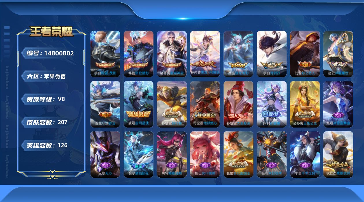 [14800802]按键13 苹果WX-207皮肤-3典藏皮肤-7传说-51史诗 【荣耀典藏】:李白鸣剑曳影,诸葛亮星域神启,韩信弑枪猎影 【传说皮肤】:孙尚香乘龙问璇玑,李白诗剑行,百里守约碎云,赵云淬星耀世,西施游龙清影,虞姬启明星使,刘备时之恋人 【限定皮肤】:大乔绒语心约,姜子牙天穹之誓,杨戬破阵退雄兵,狄仁杰阴阳师,赵云皇家上将,墨子神迹守卫,钟无艳超时空战士,扁鹊奇幻香踪,元歌无心,甄姬女儿国国王,甄姬落雪兰心,狄仁杰魔术师,项羽海滩派对,孙悟空大圣娶亲,孙悟空孙行者,后羿圣弓游侠,李元芳云中旅人,虞姬启明星使,杨戬潮玩骑兵,干将莫邪胡桃夹子,梦奇顽趣,公孙离玉兔公主,裴擒虎擒涛扼浪,嫦娥暖冬兔眠,西施玲珑珍味,桑启海盐诗旅,艾琳流音漫舞,司空震地狱燃心,阿古朵江河有灵,张良古海寻踪,蒙犽百解令,高渐离燃音魔法,妲己灵卜魔法,鬼谷子天穹祈灯,伽罗琥珀纪元,孙尚香乘龙问璇玑,沈梦溪龙舞盛年,鲁班七号蔬乡物语,李元芳蔬乡物语,刘邦剑破天穹,上官婉儿群星魔术团,程咬金群星魔术团,关羽决胜骁骑,镜青焰无极,项羽苍威无极,刘备异域游侠,芈月浮光幕影,周瑜熔金海岸 【年限皮肤】:孙尚香乘龙问璇玑 【赛季限定】:张良古海寻踪,李元芳云中旅人,梦奇顽趣,裴擒虎擒涛扼浪,桑启海盐诗旅,鬼谷子天穹祈灯,刘邦剑破天穹,姜子牙天穹之誓 【战令限定】:墨子神迹守卫,钟无艳超时空战士,扁鹊奇幻香踪,甄姬落雪兰心,艾琳流音漫舞,后羿圣弓游侠,杨戬潮玩骑兵,嫦娥暖冬兔眠,西施玲珑珍味,司空震地狱燃心,高渐离燃音魔法,妲己灵卜魔法,鲁班七号蔬乡物语,李元芳蔬乡物语,镜青焰无极,项羽苍威无极 【史诗皮肤】:项羽苍穹之光,阿轲暗夜猫娘,赵云皇家上将,甄姬冰雪圆舞曲,王昭君偶像歌手,狄仁杰魔术师,廉颇地狱岩魂,宫本武藏鬼剑武藏,孙尚香水果甜心,嬴政摇滚巨星,妲己魅力维加斯,妲己女仆咖啡,墨子金属风暴,刘禅绅士熊喵,李白千年之狐,吕布末日机甲,张飞乱世虎臣,夏侯惇乘风破浪,兰陵王暗隐猎兽者,诸葛亮黄金分割率,亚瑟心灵战警,百里守约特工魅影,蔡文姬舞动绿茵,刘禅天才门将,李元芳逐浪之夏,白起星夜王子,阿轲节奏热浪,孙策猫狗日记,大乔猫狗日记,孙悟空大圣娶亲,狄仁杰鹰眼统帅,钟馗乐园奇幻夜,孙悟空孙行者,甄姬女儿国国王,公孙离玉兔公主,钟无艳超时空战士,元歌无心,梦奇顽趣,扁鹊奇幻香踪,司空震地狱燃心,阿古朵江河有灵