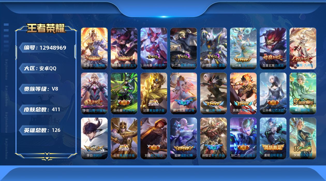 [12948969]安卓Q-V8-最强王者段位-126英雄-411皮肤-2典藏4星传说-18传说-121史诗 【英雄全皮】:刘禅全皮,达摩全皮,刘邦全皮,孙权全皮,钟馗全皮,鬼谷子全皮,狂铁全皮,蒙恬全皮,戈娅全皮,空空儿全皮,影全皮 【荣耀典藏】:孙尚香杀手不太冷,花木兰九霄神辉 【传说皮肤】:公孙离云诺千山,澜愿照九州拓,裴擒虎祥瑞亨通,桑启鸣野蒿,公孙离记忆之芯,李信山海炽霜斩,李白诗剑行,娜可露露前尘镜,虞姬启明星使,孙悟空零号赤焰,曜云鹰飞将,刘备时之恋人,貂蝉猫影幻舞,达摩黄金狮子座,百里玄策白虎志,后羿黄金射手座,孙尚香末日机甲,狄仁杰超时空战士 【限定皮肤】:蒙犽顽岩魄,蔡文姬夏日便利店,大乔绒语心约,虞姬夏日便利店,姜子牙天穹之誓,狄仁杰阴阳师,赵云皇家上将,嬴政优雅恋人,孙尚香蔷薇恋人,鲁班七号狮舞东方,庄周高山流水,高渐离死亡摇滚,阿轲迷踪丽影,钟无艳超时空战士,扁鹊奇幻香踪,白起夜都怪侠,芈月白晶晶,芈月幻夜卜梦,吕布御风骁将,元歌云间偶戏,元歌无心,夏侯惇朔风刀,甄姬游园惊梦,甄姬落雪兰心,典韦穷奇,马可波罗暗影游猎,狄仁杰魔术师,狄仁杰万华元夜,达摩星际陆战队,达摩沙漠行僧,项羽海滩派对,老夫子圣诞老人,老夫子醍醐杖,关羽冰锋战神,程咬金演武夺筹,刘邦夺宝奇兵,韩信飞衡,王昭君午后时光,兰陵王金庭之子,娜可露露前尘镜,亚瑟潮玩骑士王,孙悟空至尊宝,孙悟空大圣娶亲,孙悟空零号赤焰,孙悟空孙行者,牛魔御旌,后羿圣弓游侠,李元芳云中旅人,虞姬启明星使,钟馗神迹守卫,钟馗驱傩正仪,杨戬潮玩骑兵,干将莫邪真爱魔法,雅典娜单词大作战,雅典娜黎明之约,蔡文姬繁星吟游,鬼谷子原初探秘者,鬼谷子五谷丰年,黄忠火炮绅士,苏烈千军破阵,百里玄策白虎志,百里玄策原初追逐者,百里守约朱雀志,弈星混沌棋,梦奇顽趣,公孙离蜜橘之夏,沈梦溪大漠名商,明世隐疑决卦,裴擒虎李小龙,裴擒虎擒涛扼浪,狂铁御狮,狂铁电玩高手,米莱狄御霄,米莱狄胡桃异想国,云中君纤云弄巧,李信山海炽霜斩,盾山御銮,猪八戒西部大镖客,上官婉儿梁祝,嫦娥拒霜思,嫦娥暖冬兔眠,西施玲珑珍味,蒙犽狂想玩偶喵,鲁班大师探海日志,桑启海盐诗旅,暃星界游侠,戈娅驭风魔法,艾琳女武神,艾琳流音漫舞,司空震地狱燃心,阿古朵江河有灵,张良古海寻踪,蒙犽百解令,蒙恬荣光圣徽,高渐离燃音魔法,妲己灵卜魔法,鬼谷子天穹祈灯,伽罗琥珀纪元,姬