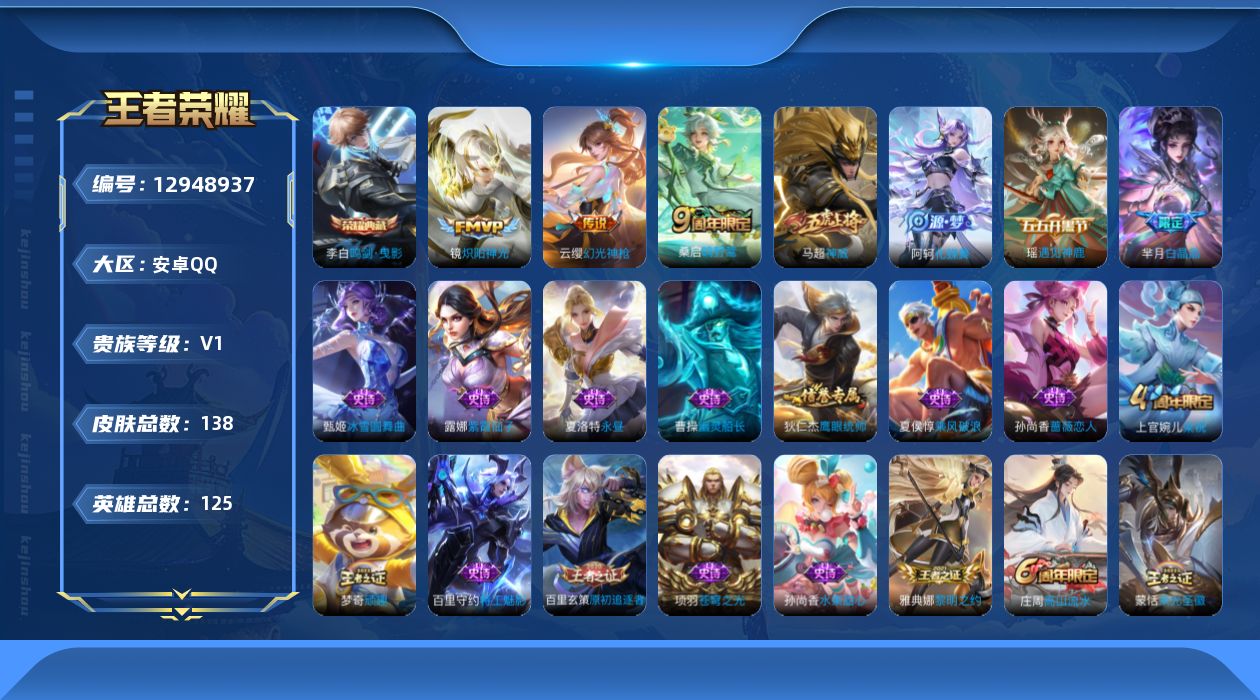 [12948937]安卓Q-V0-永恒钻石III段位-125英雄-138皮肤-1典藏-3传说-28史诗