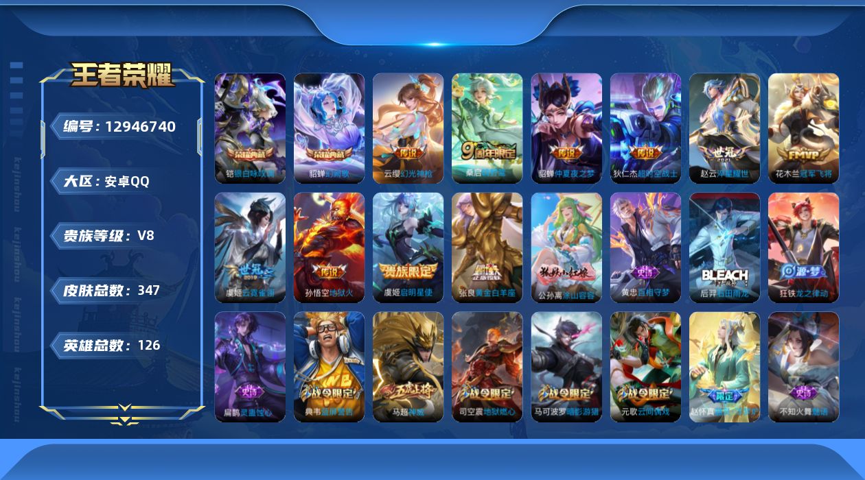 [12946740]安卓Q-V8-永恒钻石III段位-126英雄-347皮肤-2典藏-10传说-97史诗 【英雄全皮】:钟馗全皮,鬼谷子全皮,苏烈全皮,狂铁全皮,蒙恬全皮,戈娅全皮,空空儿全皮,影全皮 【荣耀典藏】:铠银白咏叹调,貂蝉幻阙歌 【传说皮肤】:云缨幻光神枪,桑启鸣野蒿,赵云淬星耀世,虞姬启明星使,张良黄金白羊座,虞姬云霓雀翎,花木兰冠军飞将,貂蝉仲夏夜之梦,孙悟空地狱火,狄仁杰超时空战士 【限定皮肤】:蒙犽顽岩魄,蔡文姬夏日便利店,虞姬夏日便利店,姜子牙天穹之誓,杨戬破阵退雄兵,狄仁杰阴阳师,赵云皇家上将,墨子神迹守卫,嬴政白昼王子,孙尚香蔷薇恋人,庄周高山流水,高渐离死亡摇滚,高渐离玩趣恶龙,钟无艳王者之锤,钟无艳超时空战士,扁鹊奇幻香踪,白起夜都怪侠,芈月幻夜卜梦,周瑜赤莲之焰,元歌云间偶戏,元歌无心,甄姬落雪兰心,典韦穷奇,典韦蓝屏警告,马可波罗暗影游猎,狄仁杰魔术师,狄仁杰万华元夜,达摩星际陆战队,达摩沙漠行僧,项羽海滩派对,老夫子醍醐杖,老夫子航海奇遇记,程咬金演武夺筹,王昭君午后时光,兰陵王金庭之子,亚瑟潮玩骑士王,牛魔御旌,后羿圣弓游侠,李元芳云中旅人,虞姬启明星使,钟馗神迹守卫,钟馗驱傩正仪,杨玉环遇见飞天,杨戬潮玩骑兵,女娲朔望之晖,干将莫邪胡桃夹子,干将莫邪真爱魔法,雅典娜黎明之约,太乙真人华丽摇滚,鬼谷子原初探秘者,鬼谷子五谷丰年,黄忠火炮绅士,苏烈玄武志,苏烈千军破阵,沈梦溪大漠名商,明世隐吟游魔法,裴擒虎李小龙,裴擒虎擒涛扼浪,狂铁御狮,狂铁电玩高手,米莱狄御霄,米莱狄胡桃异想国,嫦娥拒霜思,嫦娥暖冬兔眠,西施玲珑珍味,鲁班大师探海日志,桑启海盐诗旅,暃星界游侠,戈娅驭风魔法,艾琳流音漫舞,司空震地狱燃心,阿古朵江河有灵,张良古海寻踪,蒙犽百解令,蒙恬荣光圣徽,高渐离燃音魔法,妲己灵卜魔法,鬼谷子天穹祈灯,伽罗琥珀纪元,沈梦溪龙舞盛年,鲁班七号蔬乡物语,李元芳蔬乡物语,刘邦剑破天穹,程咬金群星魔术团,镜青焰无极,项羽苍威无极,周瑜熔金海岸 【年限皮肤】:苏烈玄武志,马超神威 【赛季限定】:典韦穷奇,狄仁杰万华元夜,达摩沙漠行僧,老夫子醍醐杖,程咬金演武夺筹,兰陵王金庭之子,张良古海寻踪,牛魔御旌,李元芳云中旅人,钟馗驱傩正仪,雅典娜黎明之约,鬼谷子原初探秘者,苏烈千军破阵,沈梦溪大漠名商,裴擒虎擒涛扼浪,狂铁御狮,米莱狄御霄,鲁班大师探海日志,桑