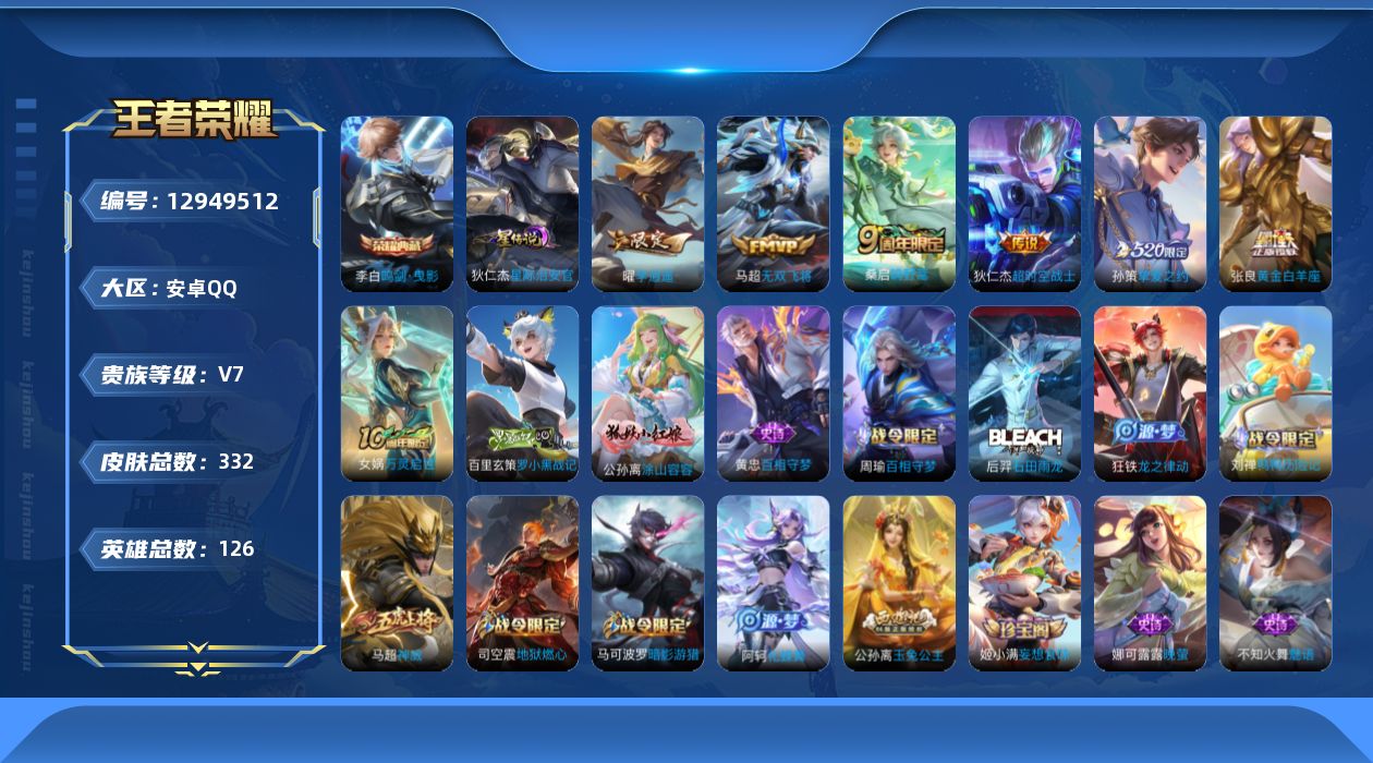 [12949512]【特价急出/详情看图】安卓Q-V7-最强王者段位-126英雄-332皮肤-1典藏-6传说-95史诗