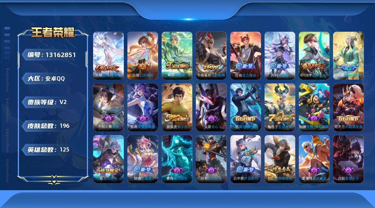 - [11626215]V8 1典藏 1无双 15传说 125英雄 223皮肤 可修改实名 优质装备:弑枪猎影(韩信典藏),器灵·螭龙剑,云鹰飞将(小将军),久胜战神,一念神魔,零号·赤焰,无双飞将,鹤羽星尊,惊梅引,霜月吟,澜逐花归海 传说皮:典韦战鼓燎原,云诺千山 珍宝阁皮:妄想食味 限定皮:愿照·九州拓(澜年限),鸣野蒿,诗剑行,五谷丰年,孙行者,美猴王,百木心枪,神器·万象笔 史诗皮:鸭鸭历险记-刘禅,化蝶舞,星界战将,谪仙醉月,龙之律动,雪豹·霜爪,百相守梦-周瑜,茶境仙,破空之剑,埋骨钱,上官婉儿群星魔术团,蔬乡物语(鲁班七号),星界特工,紫霞仙子,黄金分割率,特工魅影,江河有灵,百解令(蒙犽),高渐离燃音魔法,青蛇,偶像歌手,白蛇,暗夜猫娘,末日机甲-吕布,猫狗日记-孙策,猫狗日记-大乔,乱世虎臣,节奏热浪,修罗,女仆咖啡,水果甜心,绅士熊喵,天才门将,心灵骇客,暗隐猎兽者,鬼剑武藏,暗渊魔法,心灵战警,地狱岩魂,纤云弄巧,拒霜思,缤纷独角兽,乘风破浪,月团寄思,水晶猎龙者,曙光守护者,金属风暴,圣诞恋歌,鹰眼统帅,赏金猎手,无心,未来纪元-赵云