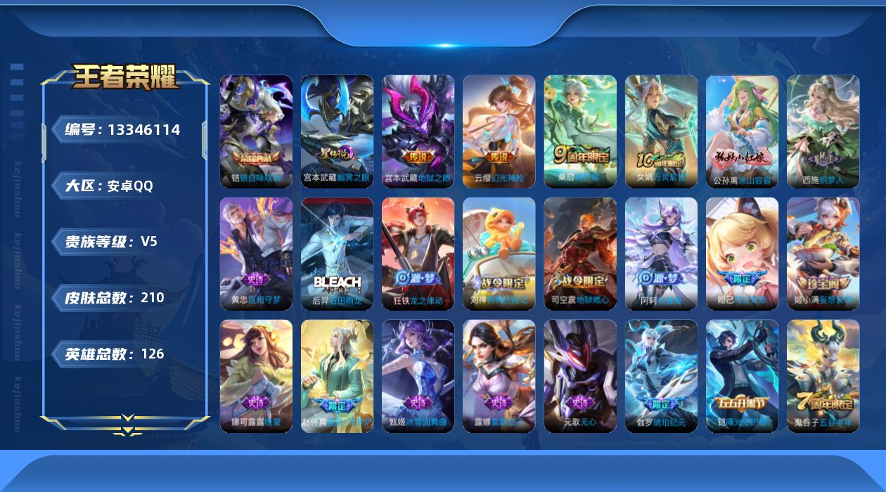 [13346114]可二次【店主推荐捡漏号!可直接换绑】安卓Q-V5-最强王者段位-126英雄-210皮肤-1典藏-4传说-58史诗
