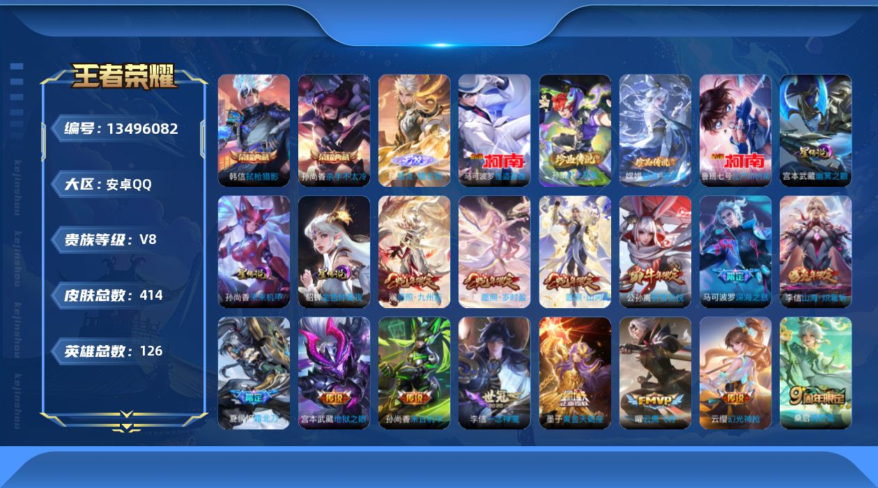 [13496082]【店主推荐捡漏号!可直接换绑】安卓Q-V8-至尊星耀II段位-126英雄-414皮肤-2典藏-3星传说-1无双-4珍品传说-24传说-125史诗