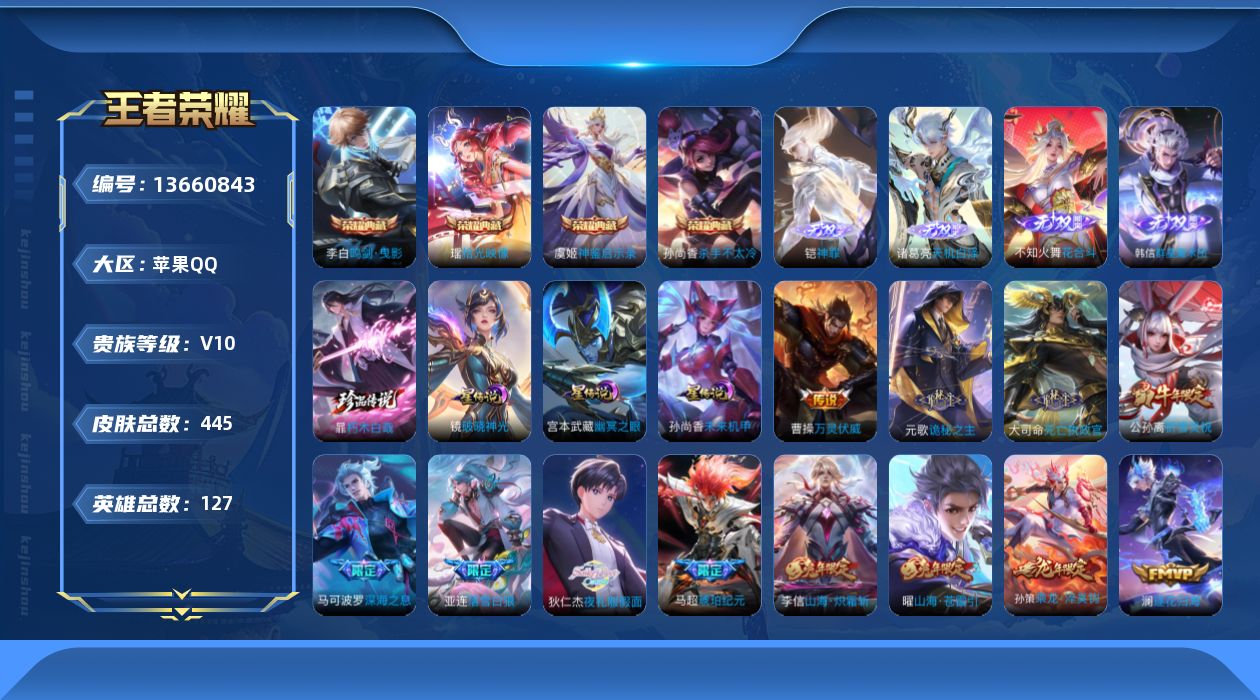 [13660843]【店主推荐捡漏号!可直接换绑】苹果Q-V10-最强王者段位-127英雄-445皮肤-4典藏-4无双-1珍品传说-53传说-136史诗