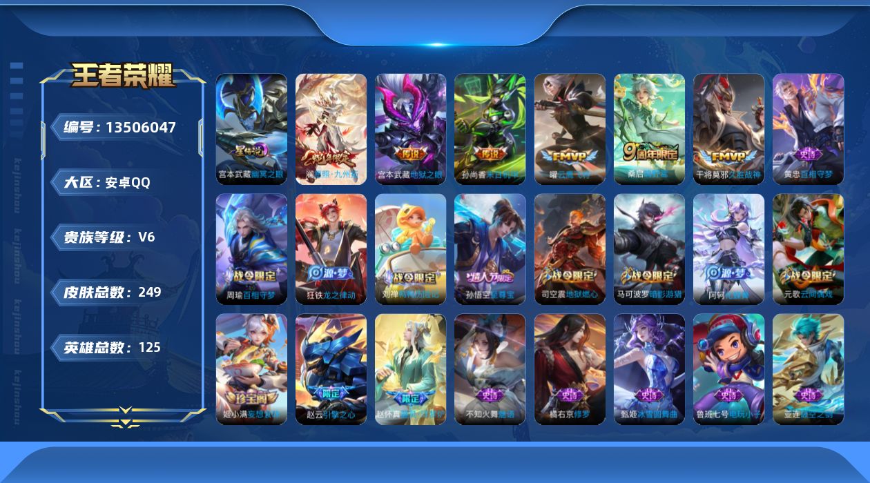 [13506047]可二次【店主推荐捡漏号!可直接换绑】安卓Q-V6-最强王者段位-125英雄-249皮肤,-6传说-71史诗 【传说皮肤】:澜愿照九州拓,桑启鸣野蒿,曜云鹰飞将,干将莫邪久胜战神,孙尚香末日机甲,宫本武藏地狱之眼 【限定皮肤】:姜子牙天穹之誓,狄仁杰阴阳师,赵云皇家上将,赵云引擎之心,孙尚香蔷薇恋人,庄周高山流水,元歌云间偶戏,元歌无心,夏侯惇朔风刀,马可波罗暗影游猎,狄仁杰魔术师,狄仁杰万华元夜,达摩星际陆战队,达摩沙漠行僧,项羽海滩派对,老夫子醍醐杖,程咬金演武夺筹,兰陵王金庭之子,孙悟空至尊宝,李元芳云中旅人,钟馗驱傩正仪,杨玉环遇见飞天,干将莫邪胡桃夹子,雅典娜黎明之约,蔡文姬繁星吟游,鬼谷子原初探秘者,鬼谷子五谷丰年,苏烈千军破阵,百里玄策原初追逐者,弈星混沌棋,梦奇顽趣,沈梦溪大漠名商,明世隐疑决卦,裴擒虎李小龙,裴擒虎擒涛扼浪,狂铁御狮,米莱狄御霄,云中君纤云弄巧,盾山御銮,嫦娥拒霜思,嫦娥暖冬兔眠,鲁班大师探海日志,桑启海盐诗旅,暃星界游侠,艾琳流音漫舞,司空震地狱燃心,阿古朵江河有灵,张良古海寻踪,蒙犽百解令,蒙恬荣光圣徽,妲己灵卜魔法,鬼谷子天穹祈灯,姬小满妄想食味,沈梦溪龙舞盛年,刘邦剑破天穹,程咬金群星魔术团,刘备异域游侠,周瑜熔金海岸 【赛季限定】:夏侯惇朔风刀,狄仁杰万华元夜,达摩沙漠行僧,老夫子醍醐杖,程咬金演武夺筹,兰陵王金庭之子,张良古海寻踪,李元芳云中旅人,钟馗驱傩正仪,雅典娜黎明之约,鬼谷子原初探秘者,苏烈千军破阵,百里玄策原初追逐者,弈星混沌棋,梦奇顽趣,沈梦溪大漠名商,明世隐疑决卦,裴擒虎擒涛扼浪,狂铁御狮,米莱狄御霄,盾山御銮,鲁班大师探海日志,桑启海盐诗旅,鬼谷子天穹祈灯,蒙恬荣光圣徽,刘邦剑破天穹,姜子牙天穹之誓 【战令限定】:元歌云间偶戏,马可波罗暗影游猎,达摩星际陆战队,艾琳流音漫舞,嫦娥暖冬兔眠,司空震地狱燃心,暃星界游侠,妲己灵卜魔法 【史诗皮肤】:鲁班七号电玩小子,赵云皇家上将,赵云未来纪元,貂蝉圣诞恋歌,甄姬冰雪圆舞曲,王昭君偶像歌手,狄仁杰魔术师,宫本武藏鬼剑武藏,孙尚香蔷薇恋人,孙尚香水果甜心,妲己魅力维加斯,妲己女仆咖啡,墨子金属风暴,吕布圣诞狂欢,刘禅绅士熊喵,曹操幽灵船长,吕布末日机甲,张飞乱世虎臣,孙悟空至尊宝,赵云引擎之心,花木兰水晶猎龙者,夏侯惇乘风破浪,小乔缤纷独角兽,兰陵王暗隐猎兽者,雅