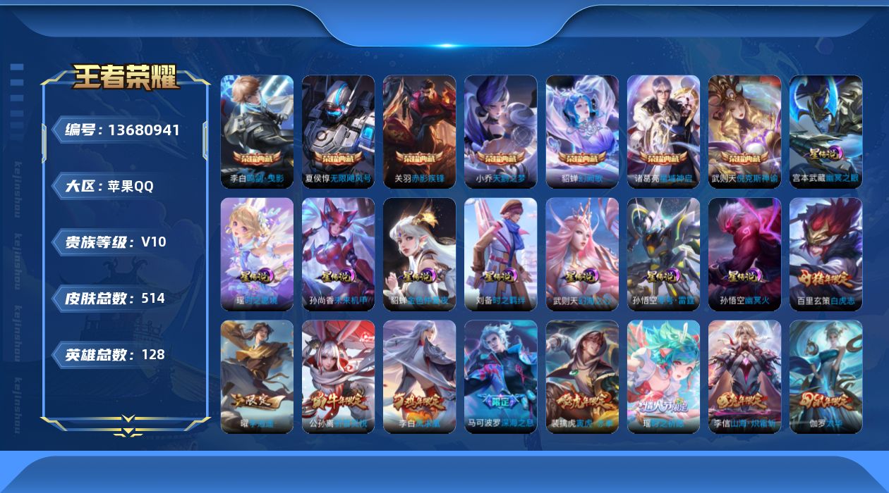 [13680941]【店主推荐捡漏号!可直接换绑/42段打野/34段中路/33段发育/九千八省50镜/4省标10市标】:苹果Q-V10-最强王者段位-128英雄-514皮肤-7典藏-8星元-58传说-179史诗