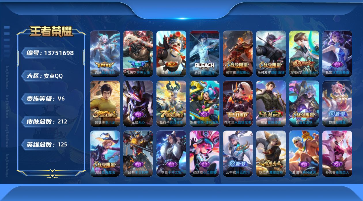 - [12001311]V8 1典藏 1无双 2珍品传说 21传说 122英雄 223皮肤 可修改实名 优质装备:无限飓风号(高达),器灵·螭龙剑,江户川柯南,怪盗基德,云鹰飞将(小将军),黄金白羊座,久胜战神,一念神魔,末日机甲-孙尚香(绿蚂蚱),地狱之眼,浮生妄,妄想实况,澜逐花归海 传说皮:乘龙·铭钟鼎(赵云年限),典韦战鼓燎原,幻光神枪 珍宝阁皮:女武神 限定皮:愿照·九州拓(澜年限),愿照·福禄聚(蔡文姬年限),愿照·岁时盈(虞姬年限),愿照·山河定(司空震年限),愿照·众生和(妲己年限),愿照·千秋盛(女娲年限),逐霄战戟,陌上桑,鸣野蒿,飞衡(韩信年限),诗剑行,李小龙,孙行者,山海·玄木吟(马可年限) 史诗皮:鸭鸭历险记-刘禅,星界战将,龙之律动,茶境仙,撼地雄心,破空之剑,蒙犽顽岩魄,蔬乡物语(鲁班七号),百相守梦-百里守约,百相守梦-黄忠,紫霞仙子,特工魅影,千年之狐,永昼,高渐离燃音魔法,偶像歌手,猫狗日记-孙策,时之恋人-孙尚香,乱世虎臣,节奏热浪,修罗,摇滚巨星,水果甜心,天才门将,星夜王子,心灵骇客,功夫厨神,德古拉伯爵,暗隐猎兽者,幽灵船长,鬼剑武藏,心灵战警,天秀·启明,舞动绿茵,诗语江南,繁星吟游(呼啦呼啦),乘风破浪,水晶猎龙者,曙光守护者,箭羽风息,金属风暴,鹰眼统帅,暗夜贵公子,魅力维加斯,未来纪元-赵云