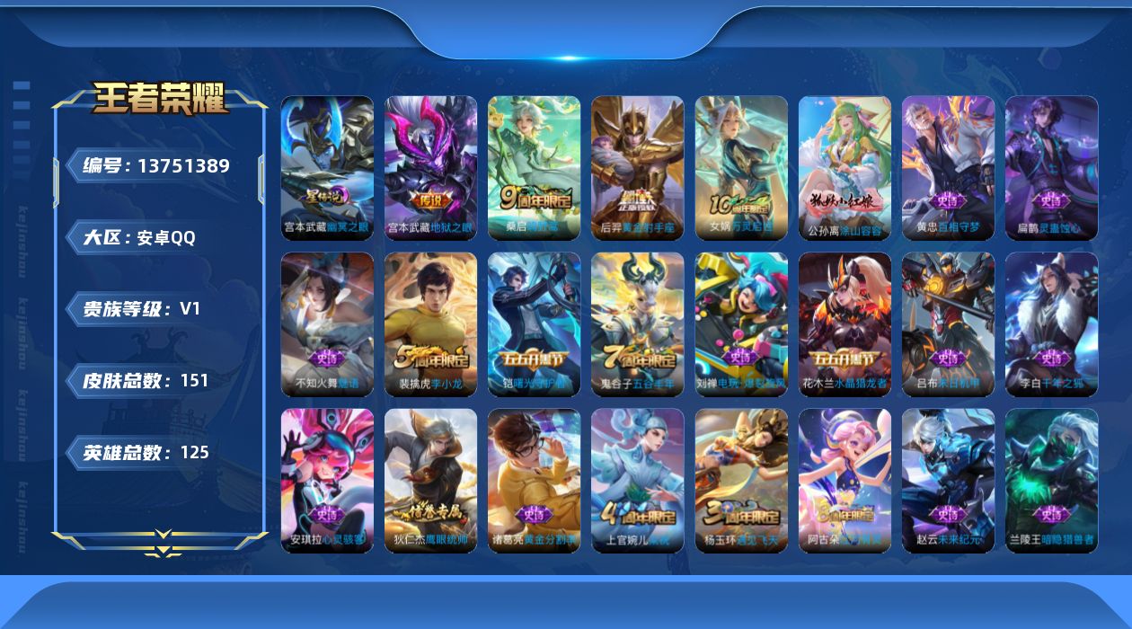 [13751389]可二次【店主推荐捡漏号!可直接换绑】:安卓Q-V3-尊贵铂金IV段位-125英雄-151皮肤-1星元-4传说-37史诗 【传说皮肤】:后羿神树通天,桑启鸣野蒿,后羿黄金射手座,宫本武藏地狱之眼 【限定皮肤】:白起狰,蒙犽顽岩魄,姜子牙天穹之誓,狄仁杰阴阳师,庄周高山流水,芈月重明,曹操烛龙,典韦穷奇,狄仁杰万华元夜,老夫子醍醐杖,程咬金演武夺筹,李元芳云中旅人,钟馗驱傩正仪,杨玉环遇见飞天,太乙真人饕餮,鬼谷子原初探秘者,鬼谷子五谷丰年,苏烈千军破阵,沈梦溪大漠名商,明世隐疑决卦,裴擒虎李小龙,裴擒虎擒涛扼浪,狂铁御狮,上官婉儿梁祝,鲁班大师探海日志,桑启海盐诗旅,艾琳女武神,阿古朵江河有灵,张良古海寻踪,鬼谷子天穹祈灯,周瑜熔金海岸 【赛季限定】:白起狰,芈月重明,曹操烛龙,典韦穷奇,狄仁杰万华元夜,老夫子醍醐杖,程咬金演武夺筹,张良古海寻踪,李元芳云中旅人,钟馗驱傩正仪,太乙真人饕餮,鬼谷子原初探秘者,苏烈千军破阵,沈梦溪大漠名商,明世隐疑决卦,裴擒虎擒涛扼浪,狂铁御狮,鲁班大师探海日志,桑启海盐诗旅,鬼谷子天穹祈灯,姜子牙天穹之誓 【史诗皮肤】:赵云未来纪元,貂蝉圣诞恋歌,廉颇地狱岩魂,宫本武藏鬼剑武藏,孙尚香水果甜心,嬴政摇滚巨星,妲己魅力维加斯,墨子金属风暴,吕布圣诞狂欢,刘禅绅士熊喵,李白千年之狐,吕布末日机甲,花木兰水晶猎龙者,小乔缤纷独角兽,兰陵王暗隐猎兽者,诸葛亮黄金分割率,亚瑟心灵战警,雅典娜冰冠公主,安琪拉心灵骇客,铠曙光守护者,蔡文姬舞动绿茵,程咬金功夫厨神,杨玉环遇见飞天,伽罗箭羽风息,狄仁杰鹰眼统帅,上官婉儿梁祝,不知火舞魅语,裴擒虎李小龙,庄周高山流水,鬼谷子五谷丰年,刘禅电玩爆裂旋风,阿古朵江河有灵,蒙犽顽岩魄,扁鹊灵蛊蚀心,黄忠百相守梦,公孙离涂山容容,女娲万灵启世 【其他皮肤】:韩信教廷特使,露娜哥特玫瑰,达摩大发明家,赵云忍炎影,艾琳女武神,牛魔西部大镖客,扁鹊化身博士,宫本武藏未来纪元,安琪拉玩偶对对碰,姜子牙时尚教父,妲己少女阿狸,典韦黄金武士,亚瑟死亡骑士,达摩拳王,花木兰兔女郎,张飞五福同心,甄姬花好人间,后羿阿尔法小队,狄仁杰阴阳师,刘备纽约教父,刘备汉昭烈帝,关羽龙腾万里,白起狰,钟无艳海滩丽影,太乙真人饕餮,宫本武藏霸王丸,曹操烛龙,芈月重明,狂铁命运角斗场,老夫子功夫老勺,孙尚香沉稳之力,典韦穷奇,狂铁御狮,苏