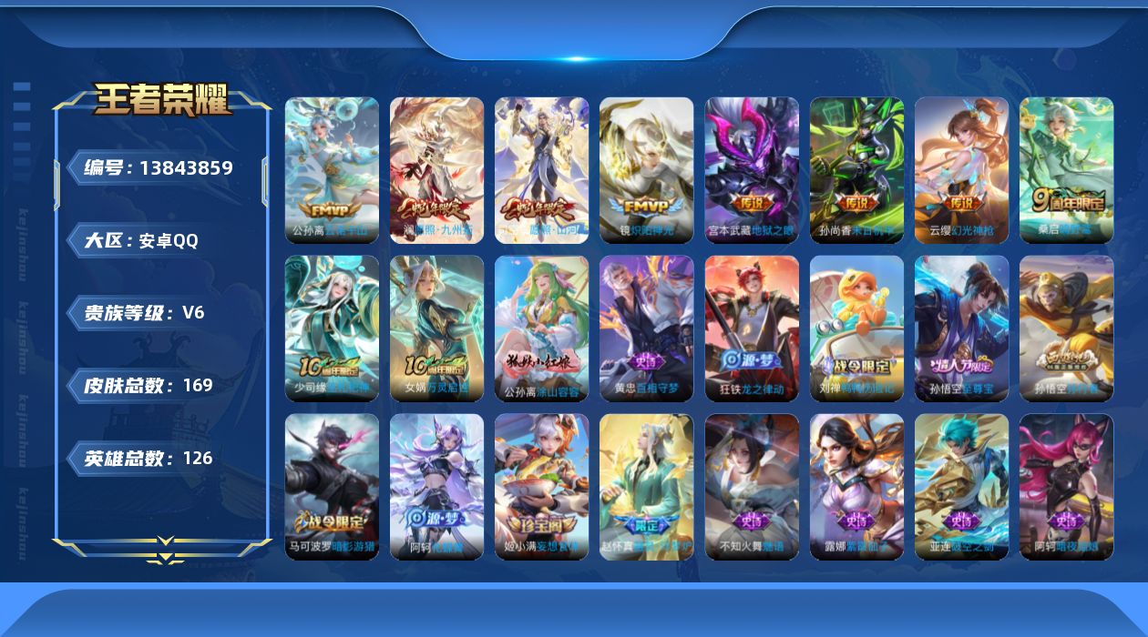 [13843859]【店主推荐捡漏号!可直接换绑】安卓Q-V6-最强王者段位-126英雄-169皮肤-8传说-53史诗 【英雄全皮】:蒙恬全皮,影全皮 【传说皮肤】:公孙离云诺千山,司空震愿照山河定,澜愿照九州拓,云缨幻光神枪,桑启鸣野蒿,镜炽阳神光,孙尚香末日机甲,宫本武藏地狱之眼 【限定皮肤】:姜子牙天穹之誓,狄仁杰阴阳师,赵云皇家上将,马可波罗暗影游猎,狄仁杰魔术师,达摩沙漠行僧,项羽海滩派对,兰陵王金庭之子,孙悟空至尊宝,孙悟空孙行者,李元芳银河之约,李元芳云中旅人,钟馗驱傩正仪,鬼谷子五谷丰年,百里玄策原初追逐者,沈梦溪大漠名商,裴擒虎擒涛扼浪,鲁班大师探海日志,桑启海盐诗旅,张良古海寻踪,蒙恬荣光圣徽,鬼谷子天穹祈灯,姬小满妄想食味,鲁班七号蔬乡物语,李元芳蔬乡物语,刘邦剑破天穹,程咬金群星魔术团,镜青焰无极,项羽苍威无极,周瑜熔金海岸 【赛季限定】:达摩沙漠行僧,兰陵王金庭之子,张良古海寻踪,李元芳云中旅人,钟馗驱傩正仪,百里玄策原初追逐者,沈梦溪大漠名商,裴擒虎擒涛扼浪,鲁班大师探海日志,桑启海盐诗旅,鬼谷子天穹祈灯,蒙恬荣光圣徽,刘邦剑破天穹,姜子牙天穹之誓 【战令限定】:马可波罗暗影游猎,李元芳银河之约,鲁班七号蔬乡物语,李元芳蔬乡物语,镜青焰无极,项羽苍威无极 【史诗皮肤】:露娜紫霞仙子,阿轲暗夜猫娘,赵云皇家上将,王昭君偶像歌手,狄仁杰魔术师,宫本武藏鬼剑武藏,孙尚香水果甜心,妲己女仆咖啡,墨子金属风暴,吕布圣诞狂欢,曹操幽灵船长,李白千年之狐,吕布末日机甲,张飞乱世虎臣,孙悟空至尊宝,花木兰水晶猎龙者,夏侯惇乘风破浪,兰陵王暗隐猎兽者,诸葛亮黄金分割率,亚瑟心灵战警,雅典娜冰冠公主,铠曙光守护者,蔡文姬舞动绿茵,李元芳逐浪之夏,伽罗箭羽风息,狄仁杰鹰眼统帅,李元芳银河之约,不知火舞魅语,马可波罗暗影游猎,百里玄策原初追逐者,杨戬天秀启明,钟馗乐园奇幻夜,孙悟空孙行者,司马懿暗渊魔法,鬼谷子五谷丰年,蒙恬荣光圣徽,姬小满妄想食味,鲁班七号蔬乡物语,镜青焰无极,亚连破空之剑,马可波罗星界特工,百里守约百相守梦,牛魔星界战将,孙膑茶境仙,弈星万物之道,赵怀真器灵浮梦炉,阿轲化蝶舞,刘禅鸭鸭历险记,狂铁龙之律动,黄忠百相守梦,公孙离涂山容容,女娲万灵启世,少司缘巫礼祀神 【其他皮肤】:项羽海滩派对,韩信街头霸王,达摩大发明家,赵云忍炎影,程咬金星际陆战队,牛魔西部大