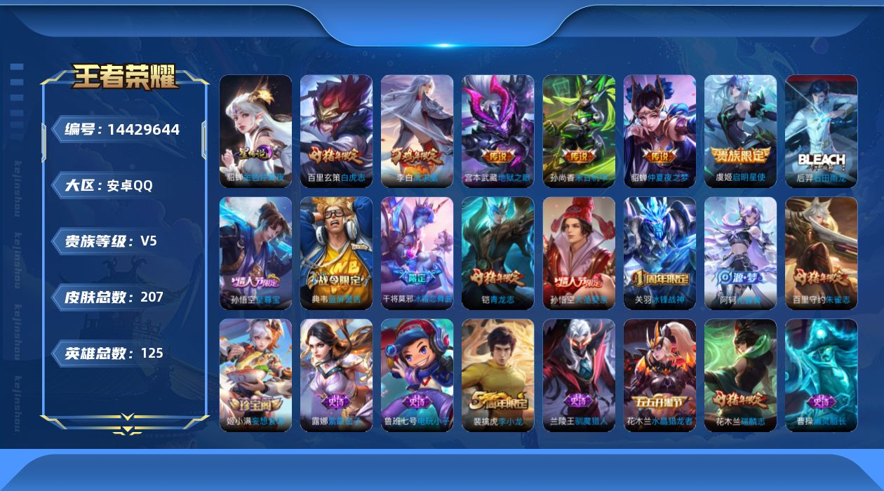 [14429644]可二次【店主推荐捡漏号!可直接换绑】安卓Q-V5-永恒钻石II段位-125英雄-207皮肤-0典藏-0珍品无双-0无双-0珍品传说-6传说-45史诗