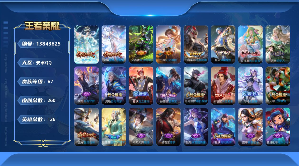 [13843625]可二次【店主推荐捡漏号!可直接换绑】安卓Q-V7-最强王者段位-125英雄-260皮肤-0典藏-0珍品无双-0无双-0珍品传说-6传说-60史诗