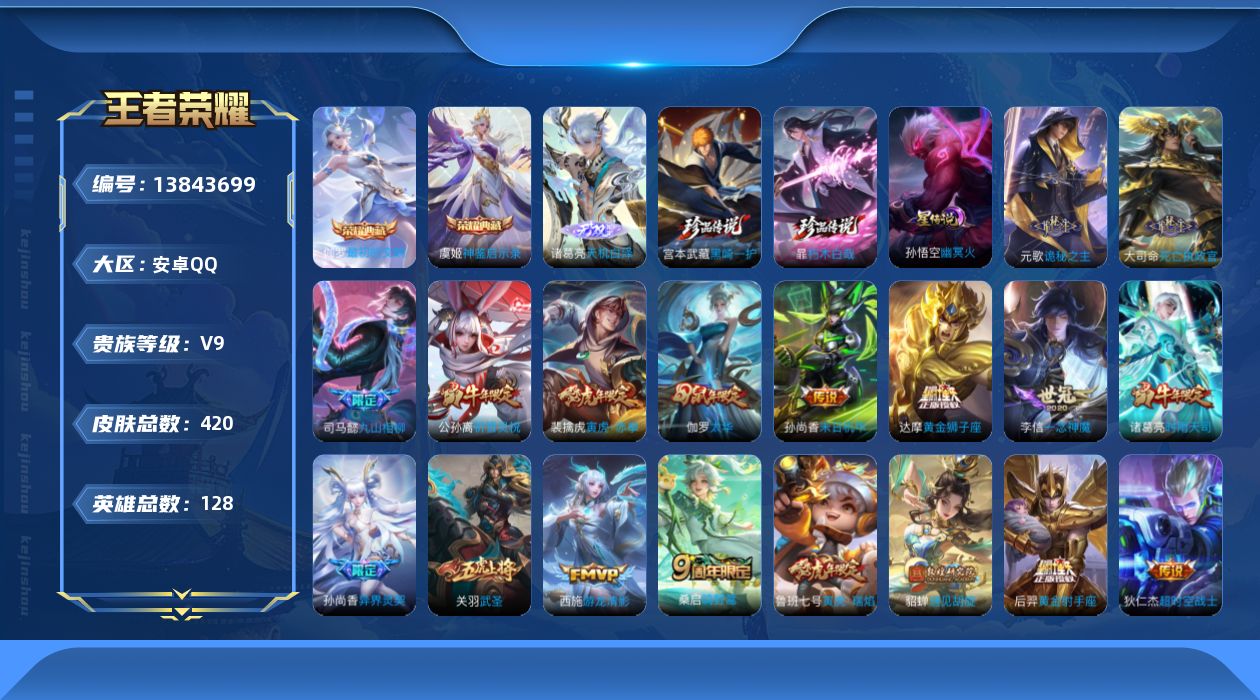[13843699]【店主推荐捡漏号!可直接换绑】 46段发育路 安卓Q-V9-至尊星耀IV段位-128英雄-420皮肤-2典藏-0珍品无双-1无双-2珍品传说-26传说-147史诗 【英雄全皮】:刘禅全皮,元歌全皮,司马懿全皮,刘邦全皮,孙权全皮,钟馗全皮,鬼谷子全皮,猪八戒全皮,大司命全皮,蒙恬全皮,空空儿全皮,影全皮 【荣耀典藏】:武则天英雄,虞姬神鉴启示录,伽罗最初的交响 【无双皮肤】:诸葛亮天机白泽 【珍品传说】:暃朽木白哉,宫本武藏黑崎一护 【传说皮肤】:后羿神树通天,干将莫邪千山共赴,元歌诡秘之主,大司命死亡执政官,司马懿九山相柳,桑启鸣野蒿,裴擒虎寅虎赤拳,鲁班七号寅虎瑞焰,孙尚香异界灵契,貂蝉遇见胡旋,赵云淬星耀世,西施游龙清影,公孙离祈雪灵祝,诸葛亮时雨天司,虞姬启明星使,关羽武圣,李信一念神魔,伽罗太华,虞姬云霓雀翎,达摩黄金狮子座,梦奇胖达荣荣,后羿黄金射手座,孙尚香末日机甲,孙悟空地狱火,武则天海洋之心,狄仁杰超时空战士 【限定皮肤】:蒙犽顽岩魄,姜子牙天穹之誓,杨戬破阵退雄兵,狄仁杰阴阳师,廉颇寅虎御盾,赵云皇家上将,赵云百木心枪,墨子神迹守卫,嬴政优雅恋人,孙尚香异界灵契,鲁班七号狮舞东方,鲁班七号乒乒小将,鲁班七号寅虎瑞焰,庄周高山流水,高渐离死亡摇滚,高渐离玩趣恶龙,阿轲迷踪丽影,钟无艳王者之锤,孙膑天狼运算者,孙膑寅虎展翼,芈月幻夜卜梦,吕布御风骁将,周瑜赤莲之焰,元歌云间偶戏,元歌无心,夏侯惇朔风刀,甄姬女儿国国王,甄姬游园惊梦,马可波罗逐梦之星,马可波罗暗影游猎,狄仁杰魔术师,狄仁杰万华元夜,达摩星际陆战队,达摩沙漠行僧,项羽海滩派对,老夫子圣诞老人,老夫子醍醐杖,老夫子航海奇遇记,关羽冰锋战神,关羽武圣,貂蝉遇见胡旋,程咬金演武夺筹,刘邦夺宝奇兵,韩信逐梦之影,韩信傲雪梅枪,兰陵王驯魔猎人,兰陵王金庭之子,花木兰青春决赛季,亚瑟潮玩骑士王,孙悟空至尊宝,孙悟空孙行者,牛魔奔雷神使,后羿如梦令,后羿圣弓游侠,李元芳银河之约,李元芳云中旅人,虞姬启明星使,钟馗神迹守卫,钟馗驱傩正仪,杨玉环遇见飞天,杨玉环寅虎心曲,干将莫邪冰霜恋舞曲,干将莫邪真爱魔法,雅典娜单词大作战,雅典娜黎明之约,蔡文姬繁星吟游,太乙真人华丽摇滚,鬼谷子原初探秘者,鬼谷子五谷丰年,诸葛亮时雨天司,黄忠火炮绅士,苏烈千军破阵,百里玄策原初追逐者,百里守约朱雀志,弈星混沌棋,梦奇