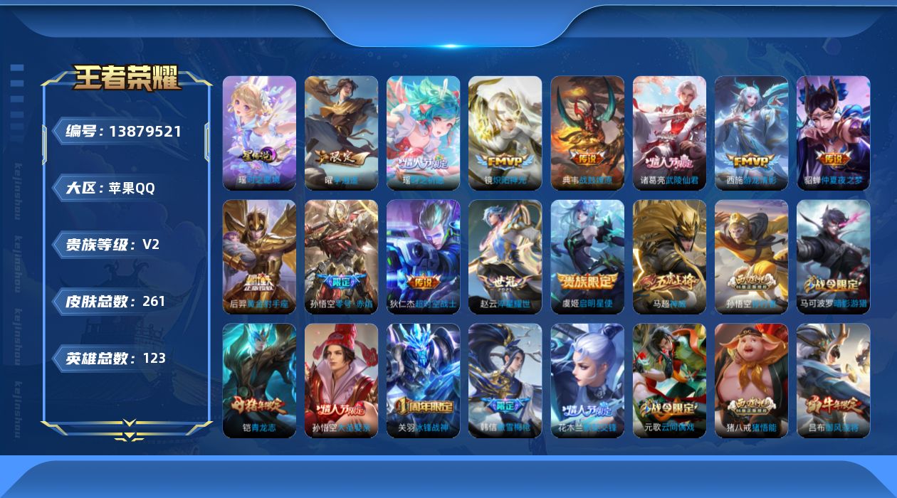 - [11623488]V7 9传说 123英雄 161皮肤 可修改实名 优质装备:黄金狮子座,黄金射手座,绛天战甲(鸡嘴战神),地狱火,淬星耀世,涂山容容 传说皮:九山相柳,云诺千山,幻光神枪 限定皮:愿照·岁时盈(虞姬年限),逐霄战戟,至尊宝,飞衡(韩信年限),遇见飞天,梁祝,李小龙 史诗皮:鸭鸭历险记-刘禅,化蝶舞,龙之律动,雪豹·霜爪,石田雨龙,茶境仙,蔬乡物语(鲁班七号),百相守梦-黄忠,紫霞仙子,千年之狐,偶像歌手,龙骑士(小龙虾),女仆咖啡,摇滚巨星,水果甜心,天才门将,功夫厨神,暗隐猎兽者,拒霜思,乘风破浪,逐浪之夏,金属风暴,圣诞狂欢,圣诞恋歌,鹰眼统帅,魅力维加斯,未来纪元-赵云