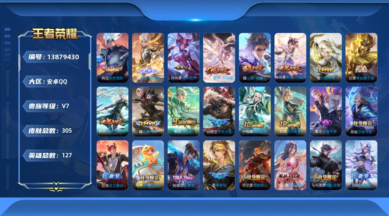 [13879430]【店主推荐捡漏号!可直接换绑】安卓Q-V7-至尊星耀III段位-127英雄-305皮肤-1典藏-1无双-10传说-84史诗 【英雄全皮】:蒙恬全皮,空空儿全皮,影全皮 【荣耀典藏】:韩信弑枪猎影 【无双皮肤】:曜器灵螭龙剑 【传说皮肤】:后羿神树通天,虞姬愿照岁时盈,桑启鸣野蒿,孙尚香乘龙问璇玑,赵云乘龙铭钟鼎,孙悟空齐天大圣,曜山海苍雷引,镜炽阳神光,曜云鹰飞将,达摩黄金狮子座 【限定皮肤】:暃埋骨钱,蒙犽顽岩魄,蔡文姬夏日便利店,大乔绒语心约,虞姬夏日便利店,姜子牙天穹之誓,李白谪仙醉月,狄仁杰阴阳师,赵云皇家上将,赵云百木心枪,嬴政优雅恋人,孙尚香蔷薇恋人,阿轲迷踪丽影,扁鹊奇幻香踪,白起夜都怪侠,元歌云间偶戏,马可波罗暗影游猎,狄仁杰魔术师,狄仁杰万华元夜,达摩沙漠行僧,项羽海滩派对,老夫子醍醐杖,程咬金演武夺筹,韩信傲雪梅枪,王昭君午后时光,兰陵王金庭之子,孙悟空美猴王,孙悟空至尊宝,孙悟空齐天大圣,李元芳银河之约,李元芳云中旅人,钟馗驱傩正仪,杨戬潮玩骑兵,雅典娜黎明之约,鬼谷子五谷丰年,苏烈千军破阵,沈梦溪大漠名商,裴擒虎擒涛扼浪,云中君纤云弄巧,猪八戒猪悟能,嫦娥拒霜思,曜山海苍雷引,西施玲珑珍味,鲁班大师探海日志,桑启海盐诗旅,戈娅驭风魔法,艾琳流音漫舞,司空震地狱燃心,阿古朵江河有灵,张良古海寻踪,蒙犽百解令,蒙恬荣光圣徽,高渐离燃音魔法,妲己灵卜魔法,鬼谷子天穹祈灯,伽罗琥珀纪元,安琪拉乘龙聚宝船,孙尚香乘龙问璇玑,赵云乘龙铭钟鼎,沈梦溪龙舞盛年,鲁班七号蔬乡物语,李元芳蔬乡物语,刘邦剑破天穹,程咬金群星魔术团,关羽决胜骁骑,镜青焰无极,项羽苍威无极,刘备异域游侠,周瑜熔金海岸 【年限皮肤】:孙悟空美猴王,曜山海苍雷引,安琪拉乘龙聚宝船,孙尚香乘龙问璇玑,赵云乘龙铭钟鼎 【赛季限定】:狄仁杰万华元夜,达摩沙漠行僧,老夫子醍醐杖,程咬金演武夺筹,兰陵王金庭之子,张良古海寻踪,李元芳云中旅人,钟馗驱傩正仪,雅典娜黎明之约,苏烈千军破阵,沈梦溪大漠名商,裴擒虎擒涛扼浪,鲁班大师探海日志,桑启海盐诗旅,鬼谷子天穹祈灯,蒙恬荣光圣徽,刘邦剑破天穹,姜子牙天穹之誓 【战令限定】:蔡文姬夏日便利店,虞姬夏日便利店,阿轲迷踪丽影,扁鹊奇幻香踪,白起夜都怪侠,元歌云间偶戏,马可波罗暗影游猎,王昭君午后时光,艾琳流音漫舞,李元芳银河之约,杨戬潮玩骑兵,西施玲珑珍