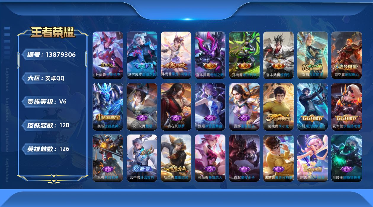 [13879306]【店主推荐捡漏号!可直接换绑】安卓Q-V6-最强王者段位-126英雄-128皮肤-6传说-33史诗 【传说皮肤】:后羿神树通天,孙尚香乘龙问璇玑,宫本武藏惊梅引,马可波罗深海之息,孙尚香末日机甲,宫本武藏地狱之眼 【限定皮肤】:姜子牙天穹之誓,杨戬破阵退雄兵,狄仁杰阴阳师,赵云皇家上将,孙尚香蔷薇恋人,夏侯惇朔风刀,马可波罗深海之息,狄仁杰魔术师,狄仁杰万华元夜,达摩沙漠行僧,项羽海滩派对,老夫子醍醐杖,关羽冰锋战神,程咬金演武夺筹,兰陵王金庭之子,牛魔御旌,钟馗驱傩正仪,鬼谷子原初探秘者,明世隐疑决卦,裴擒虎李小龙,云中君纤云弄巧,鲁班大师探海日志,艾琳流音漫舞,司空震地狱燃心,阿古朵江河有灵,张良古海寻踪,蒙犽百解令,鬼谷子天穹祈灯,孙尚香乘龙问璇玑,沈梦溪龙舞盛年,刘邦剑破天穹,程咬金群星魔术团,周瑜熔金海岸 【年限皮肤】:孙尚香乘龙问璇玑 【赛季限定】:夏侯惇朔风刀,狄仁杰万华元夜,达摩沙漠行僧,老夫子醍醐杖,程咬金演武夺筹,兰陵王金庭之子,张良古海寻踪,牛魔御旌,钟馗驱傩正仪,鬼谷子原初探秘者,明世隐疑决卦,鲁班大师探海日志,鬼谷子天穹祈灯,刘邦剑破天穹,姜子牙天穹之誓 【战令限定】:艾琳流音漫舞,司空震地狱燃心 【史诗皮肤】:露娜紫霞仙子,赵云皇家上将,貂蝉圣诞恋歌,甄姬冰雪圆舞曲,狄仁杰魔术师,廉颇地狱岩魂,宫本武藏鬼剑武藏,孙尚香蔷薇恋人,孙尚香水果甜心,嬴政摇滚巨星,墨子金属风暴,吕布圣诞狂欢,吕布末日机甲,张飞乱世虎臣,韩信白龙吟,关羽冰锋战神,花木兰水晶猎龙者,兰陵王暗隐猎兽者,诸葛亮黄金分割率,雅典娜冰冠公主,铠曙光守护者,蔡文姬舞动绿茵,李元芳逐浪之夏,白起星夜王子,狄仁杰鹰眼统帅,不知火舞魅语,橘右京修罗,裴擒虎李小龙,云中君纤云弄巧,司空震地狱燃心,阿古朵江河有灵,蒙犽百解令,女娲万灵启世 【其他皮肤】:项羽海滩派对,韩信教廷特使,韩信街头霸王,赵云忍炎影,扁鹊化身博士,扁鹊救世之瞳,安琪拉玩偶对对碰,孙膑天使之翼,妲己少女阿狸,亚瑟死亡骑士,达摩拳王,花木兰兔女郎,张飞五福同心,甄姬花好人间,宫本武藏万象初新,狄仁杰阴阳师,刘备纽约教父,钟无艳海滩丽影,狂铁命运角斗场,老夫子功夫老勺,李白敏锐之力,鬼谷子幻乐之宴,苏烈坚韧之力,大乔守护之力,项羽科学大爆炸,牛魔御旌,小乔丁香结,吕布野性能量,沈梦溪鲨炮海盗猫,姜子牙炽热元素使,夏侯